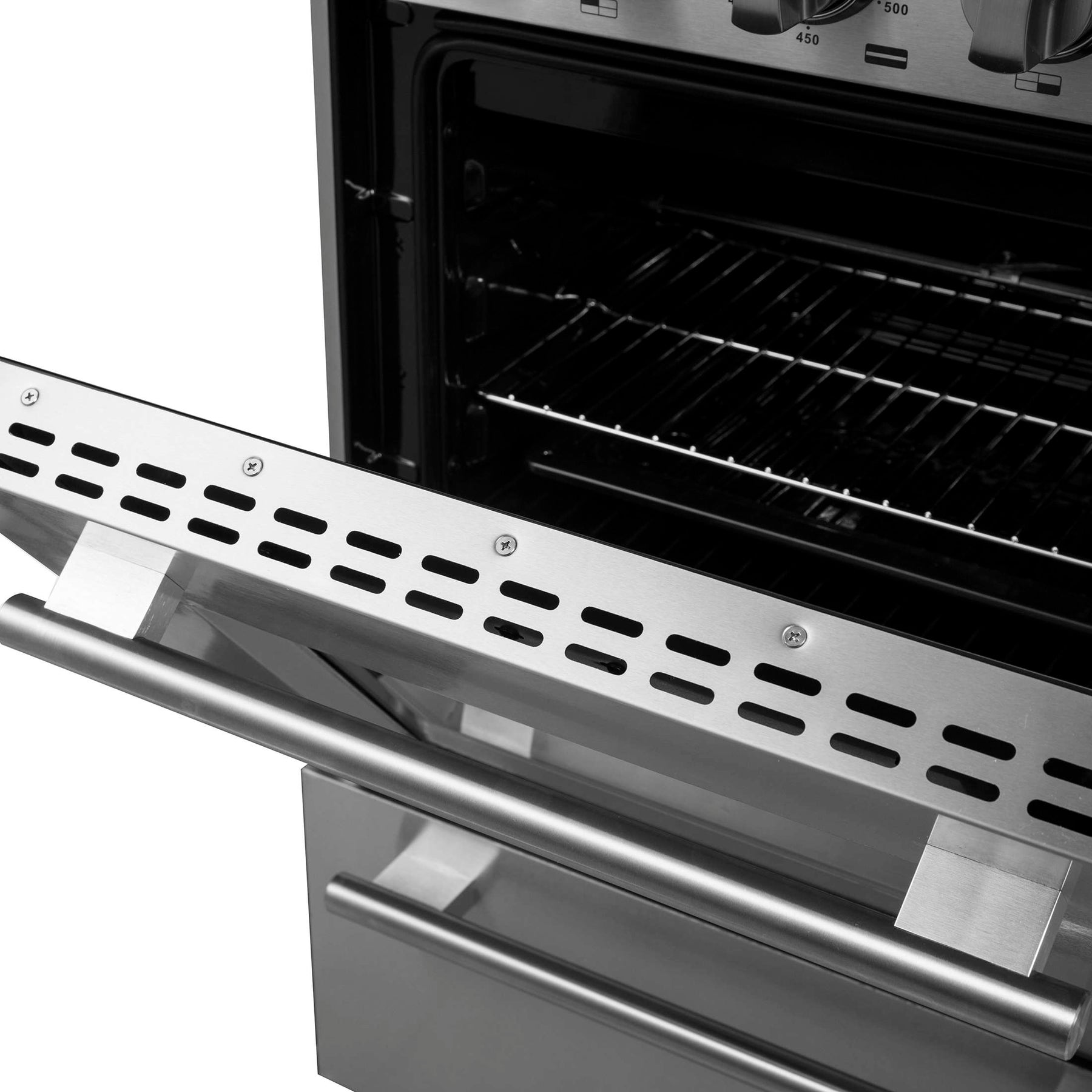 * Recessed stainless steel range top cavity contains spills for quick clean-ups