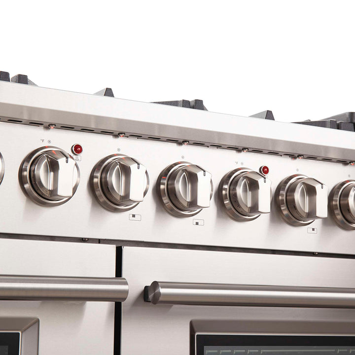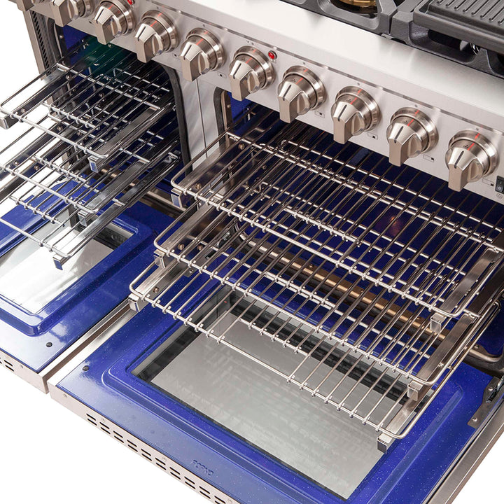 The Forno Capriasca 48 Inch Gas Range enhances your home kitchen with professional styling and performance through its durable and beautiful 304-grade stainless-steel design. The cooking surface features 8 sealed dual-ring brass burners, totaling 160,000 BTU. All burners, each at 20,000 BTU, can simmer precisely at 1,000 BTU. Continuous heavy-duty cast-iron grates facilitate easy sliding of pots or pans off heat over the enamel cooktop cavity, simplifying spill cleanup. The cumulative 6.58 cu. ft. double ovens, with a 44,000 BTU output, are enclosed in a blue enamel interior. The 4.32 cu.ft. main oven offers a powerful infrared mesh broiler, a rotisserie skewer and a convection fan for precise, and consistent cooking on multiple levels. The package includes 6 telescopic stainless-steel oven racks, 1 rotisserie kit, wok support, griddle and an LP conversion kit. Additionally, zinc-coated illuminated metal knobs with bezel rings ensure enduring beauty.