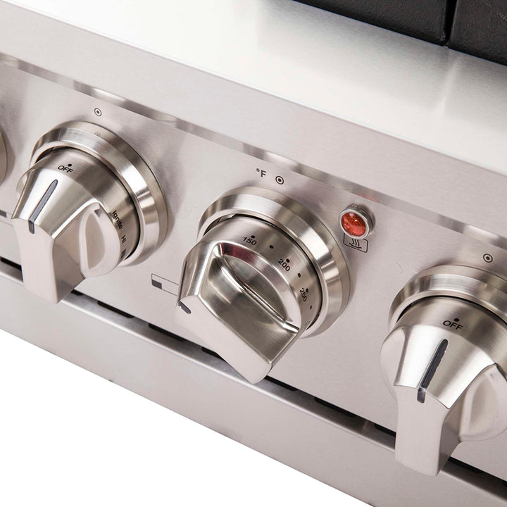 * Continuous cast iron grates ensure even heat, providing cookware stability and mobility off the source.