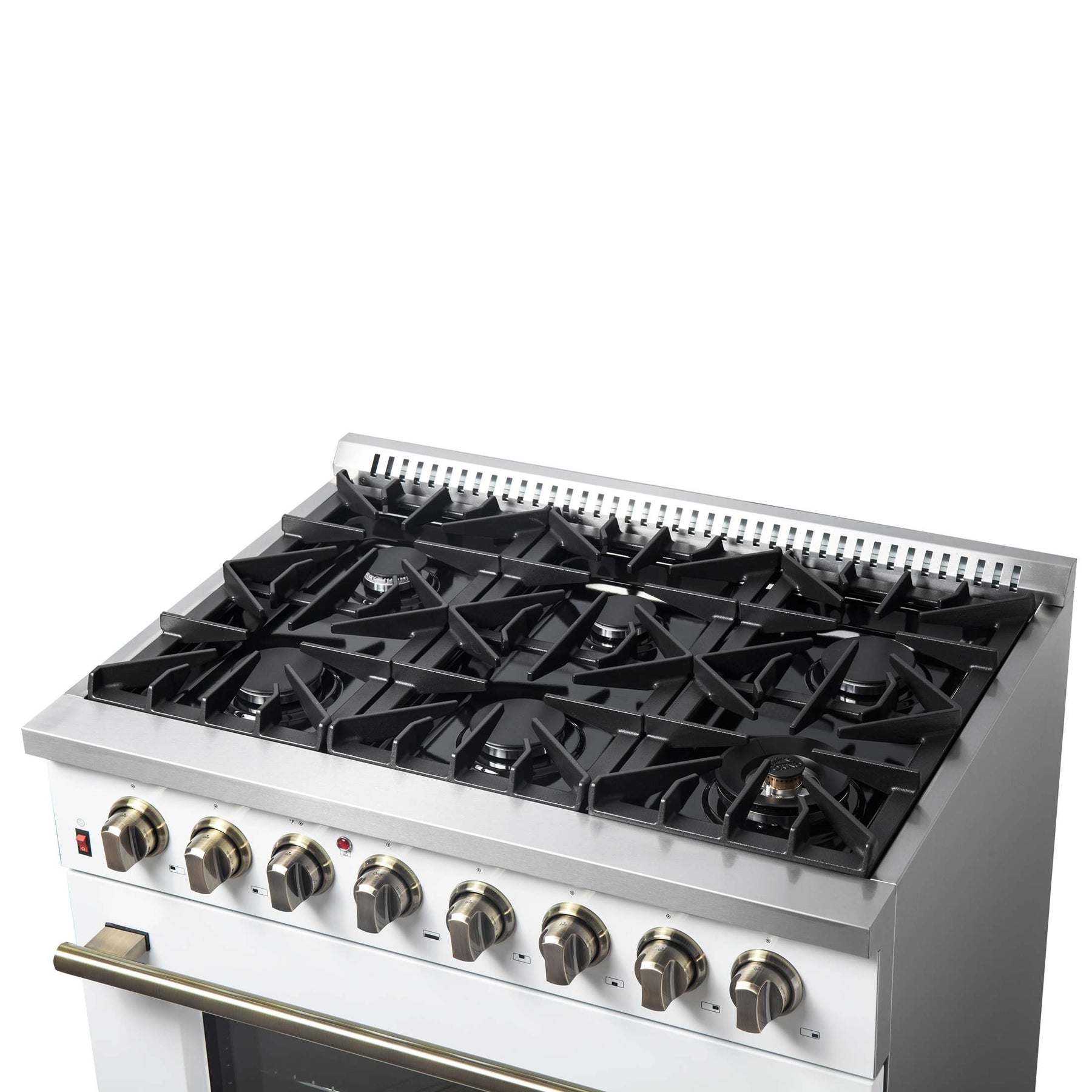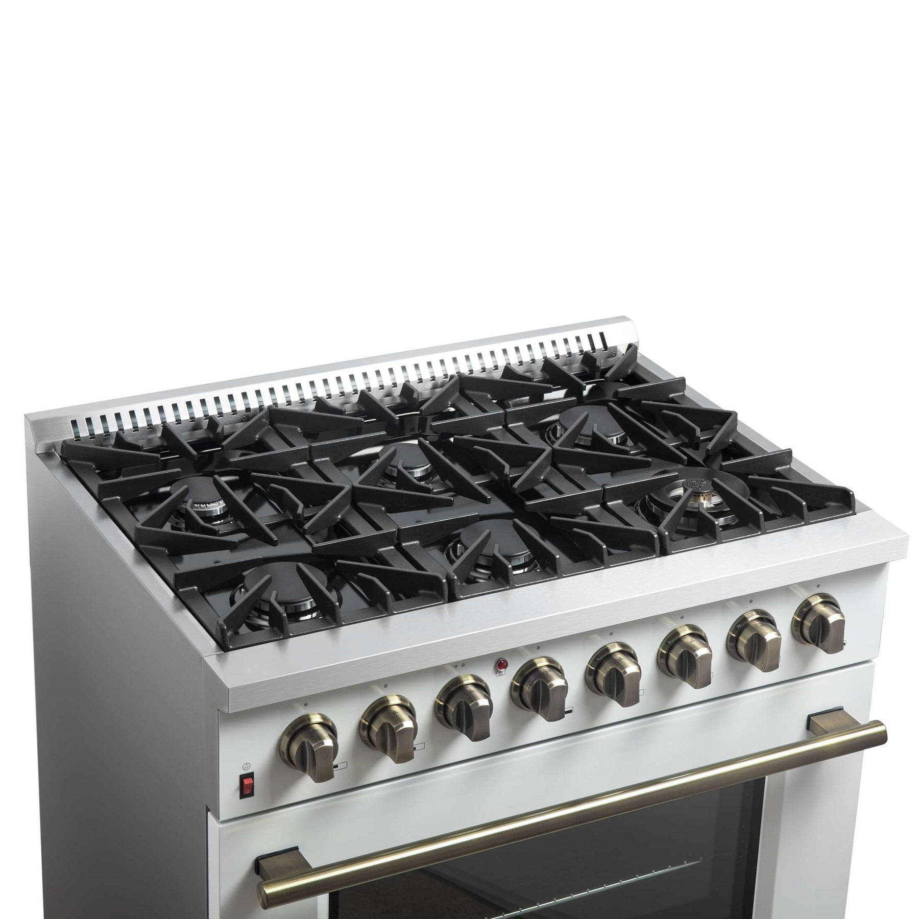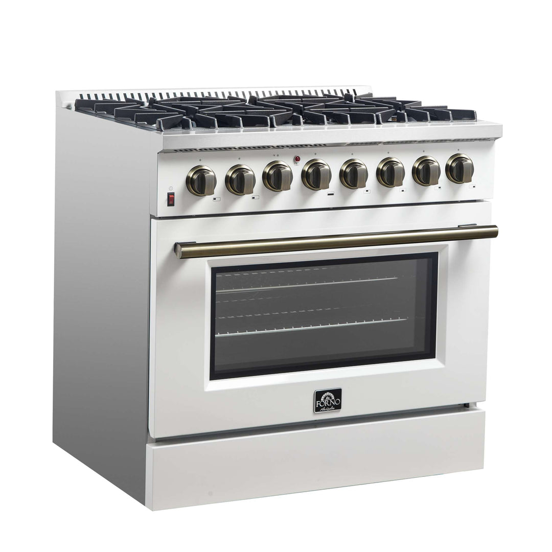 The Galiano 36" Dual Fuel Range blends professional style and performance in elegant white with antique brass accessories. Featuring six sealed burners with a total output of 83,000 BTU, including a powerful 20K dual-ring burner for boiling or searing, it gently simmers delicate foods, such as chocolate and sauces. The cast iron grates provide stability and smooth pan sliding, while the 5.26 cu. ft. electric oven delivers 6,300 watts of power, making it perfect for baking, roasting, and broiling with true convection options. Included are two oven racks, an LP conversion kit, and elegant zinc-coated metal knobs with bezel rings that retain their beauty.