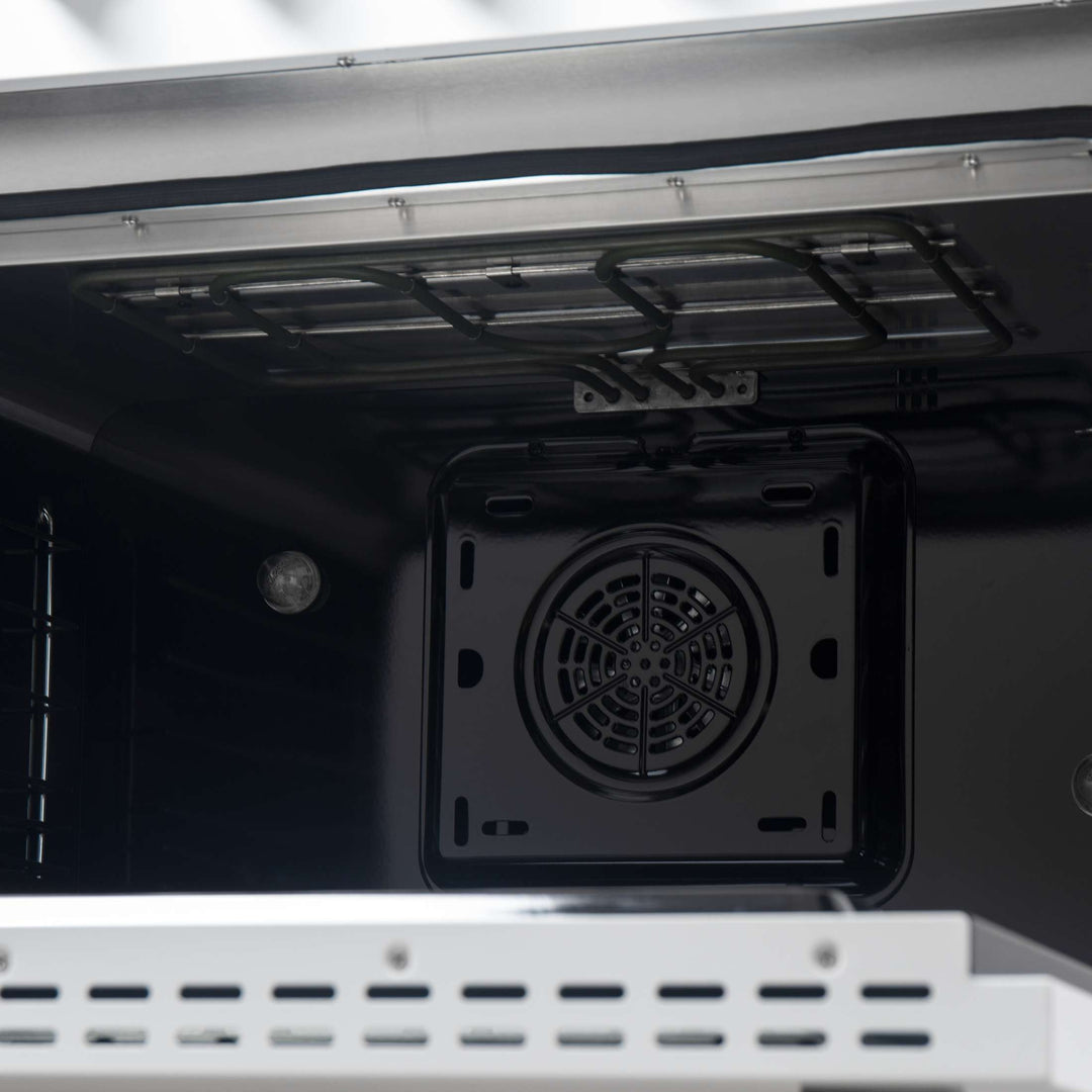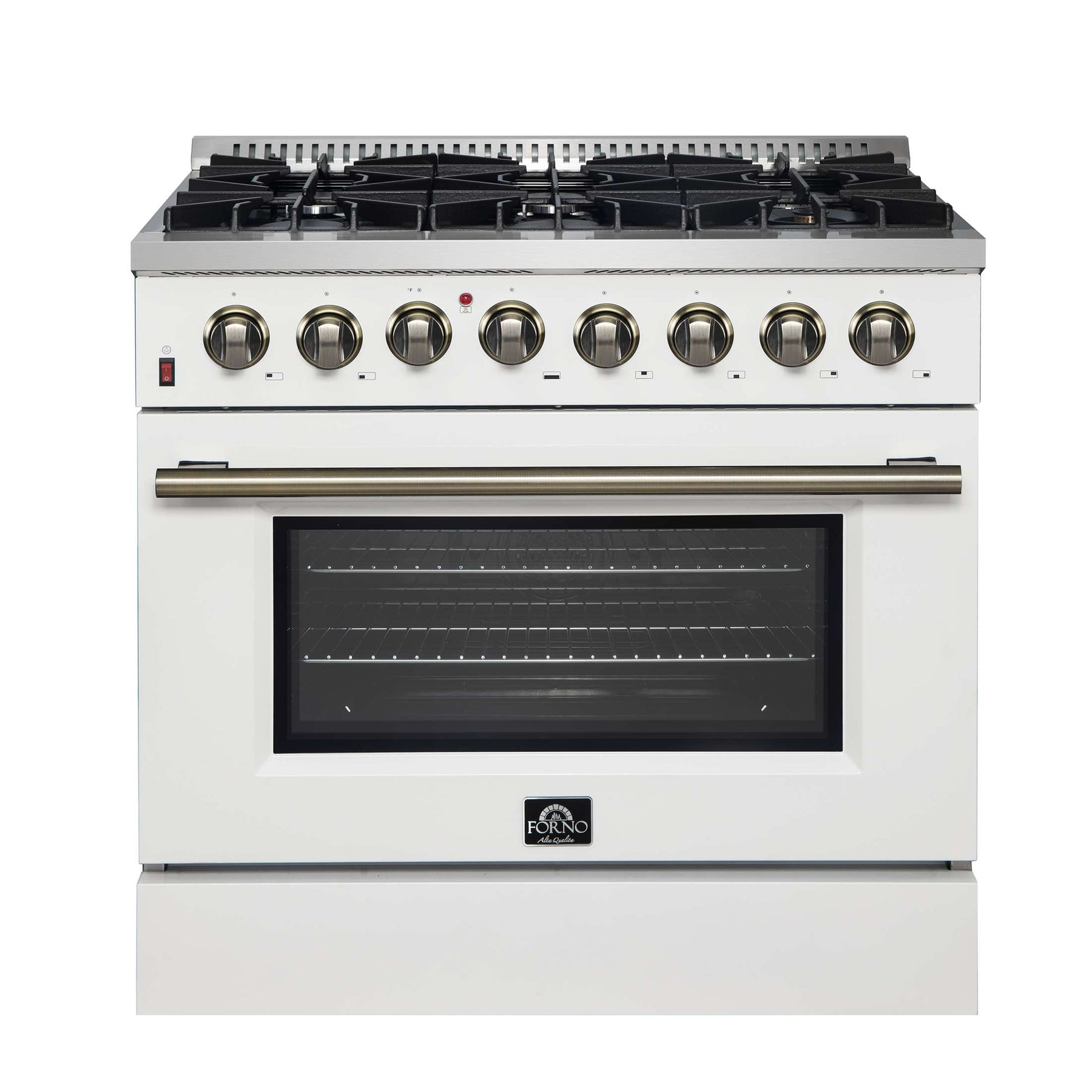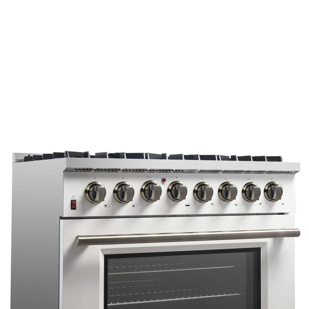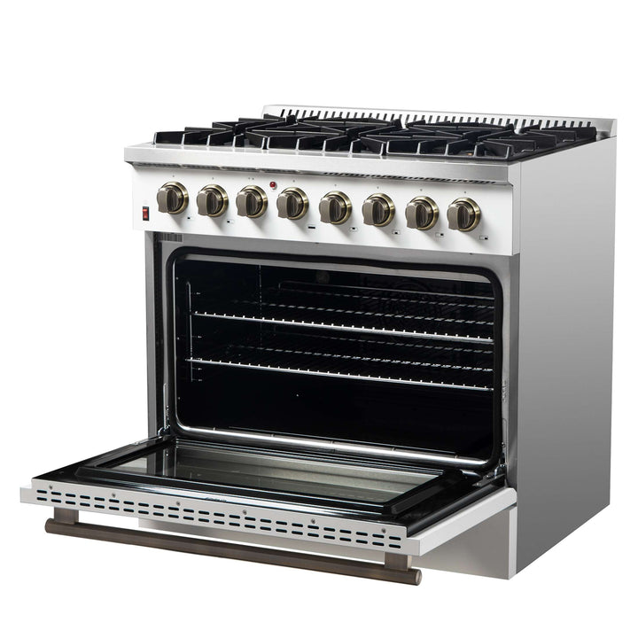 The Galiano 36" Dual Fuel Range blends professional style and performance in elegant white with antique brass accessories. Featuring six sealed burners with a total output of 83,000 BTU, including a powerful 20K dual-ring burner for boiling or searing, it gently simmers delicate foods, such as chocolate and sauces. The cast iron grates provide stability and smooth pan sliding, while the 5.26 cu. ft. electric oven delivers 6,300 watts of power, making it perfect for baking, roasting, and broiling with true convection options. Included are two oven racks, an LP conversion kit, and elegant zinc-coated metal knobs with bezel rings that retain their beauty.