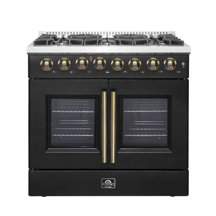 Our 36" Galiano Dual Fuel French Door Range blends timeless design and high performance. Featuring a sleek black finish and antique brass knobs, this range adds sophistication to any kitchen at an affordable price. The cooktop boasts six sealed burners with a total output of 83,000 BTU, including a 20,000 BTU dual-ring burner ideal for boiling, searing, or simmering delicate sauces. The heavy-duty cast iron grates provide a stable surface and allow you to slide cookware effortlessly across the cooktop. Its spacious 5.36 cu.ft. true convection oven delivers even heat distribution, powered by 6,300 watts, for perfectly baked and roasted dishes. Easy-to-clean black enamel interiors, French door convenience, and included electroplated racks make this range as practical as it is beautiful. Complete with an LP conversion kit and NEMA 14-50 power cord, the Galiano Range is built for both style and efficiency.