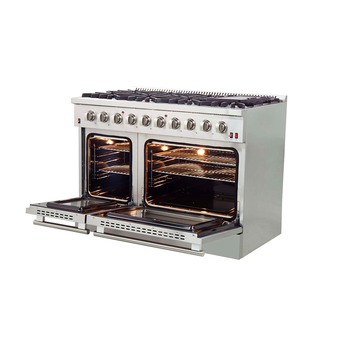 The Forno Galiano 48" Gas Range combines professional-grade performance with sleek stainless steel durability. The cooktop features 8 sealed burners with a total output of 107,000 BTU, including a 20,000 BTU dual-ring burner that can simmer at 1,000 BTU. Our cast iron grates ensure cookware stability and effortless movement between burners. The main convection oven offers 4.32 cu. ft. and delivers a total of 30,000 BTU for broiling and baking, while the secondary oven has a capacity of 2.26 cu. ft. with a 14,00 BTU for baking. Both ovens feature a sleek black enamel interior and a three-layer tempered glass door for superior heat retention and clear visibility. Additional features include 2 oven racks, an LP conversion kit, and durable zinc-coated knobs with bezel rings, built to maintain their beauty. Backed by Forno's 2-year warranty, this range offers peace of mind, lasting performance, and exceptional affordability.