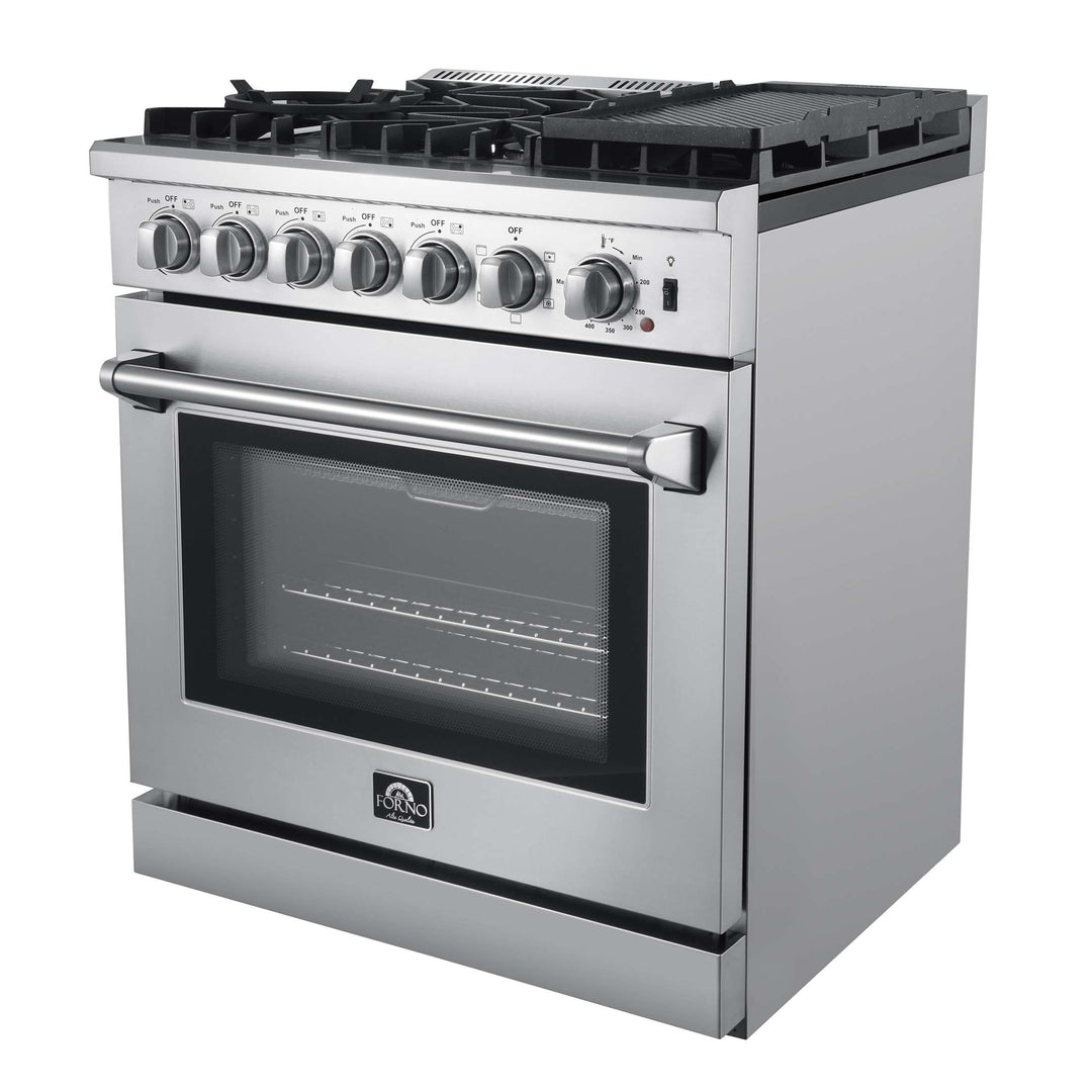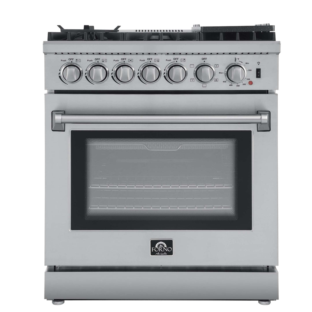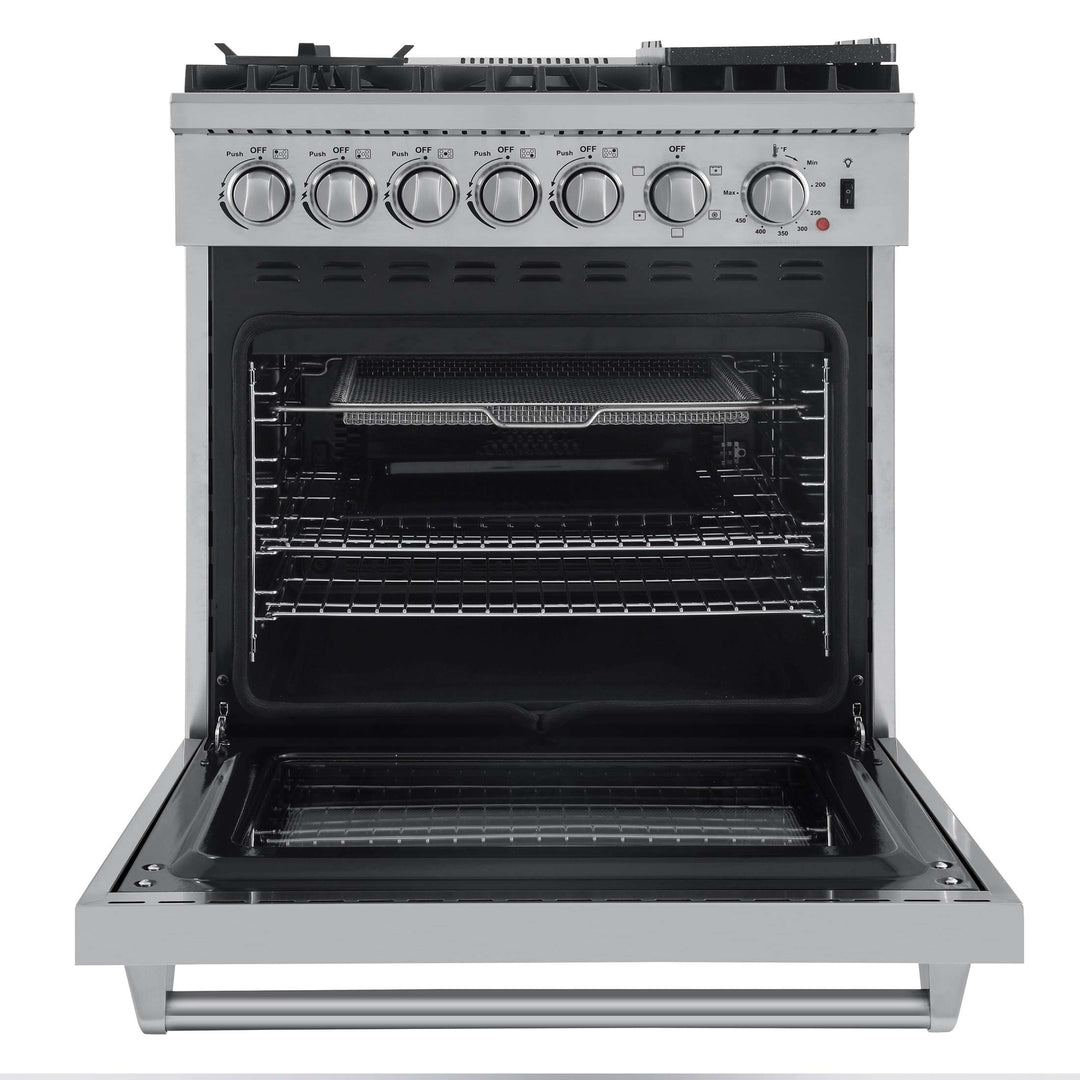 The Lazio 30 Inch Alta Qualita Dual Fuel Range blends professional design with durability. Its stainless-steel structure boasts 5 sealed burners (70,000 BTU total), including a potent dual-ring burner for boiling or searing and precise simmering. The continuous cast iron grates, wok ring, and reversible grill/griddle enhance cooking versatility. The 4.32 cu. ft. oven, with 6500 Watt combined convection broil and bake output, features an insulated 3-layer glass door for safety and visibility. The true convection element ensures fast, precise, and consistent cooking. Accessories include 2 oven racks, air fry rack & basket, drip pan (suitable for steam cleaning), and an LP conversion kit. Zinc-coated metal knobs with bezel rings ensure enduring beauty.
