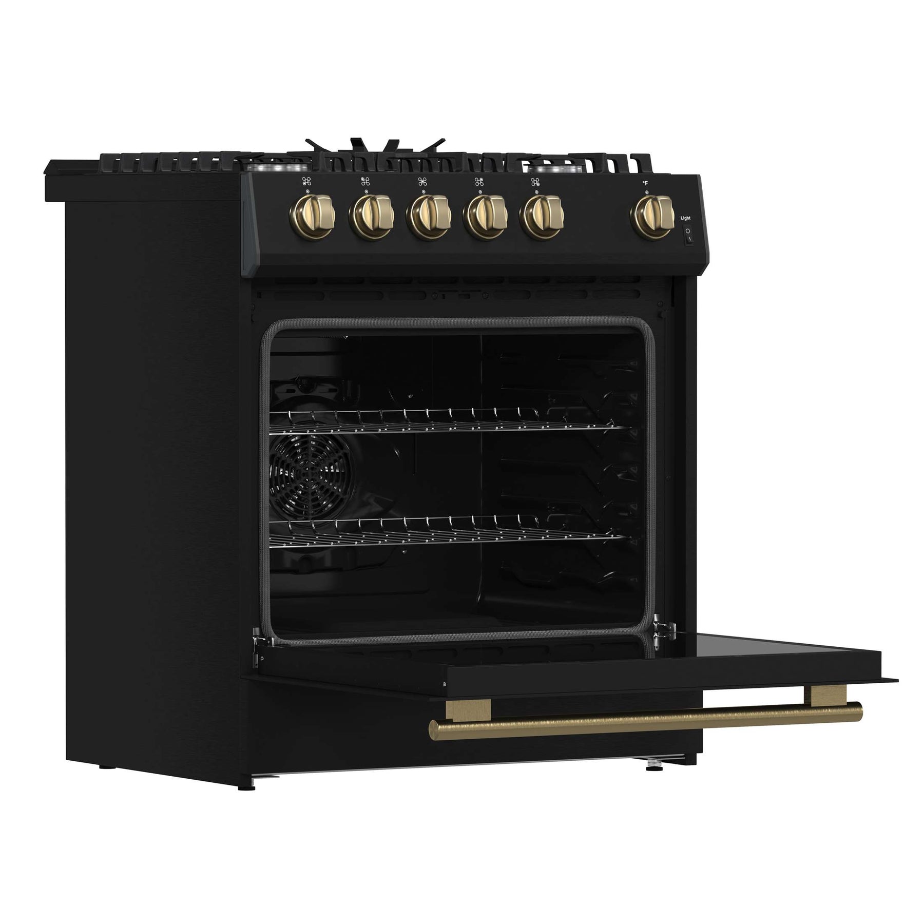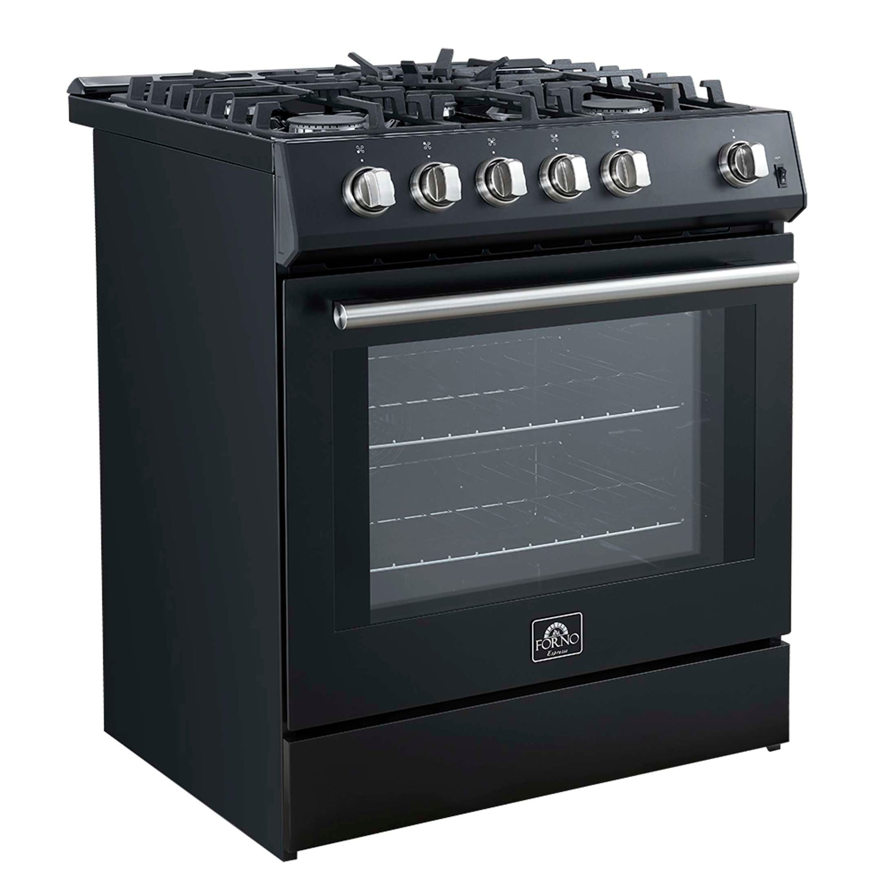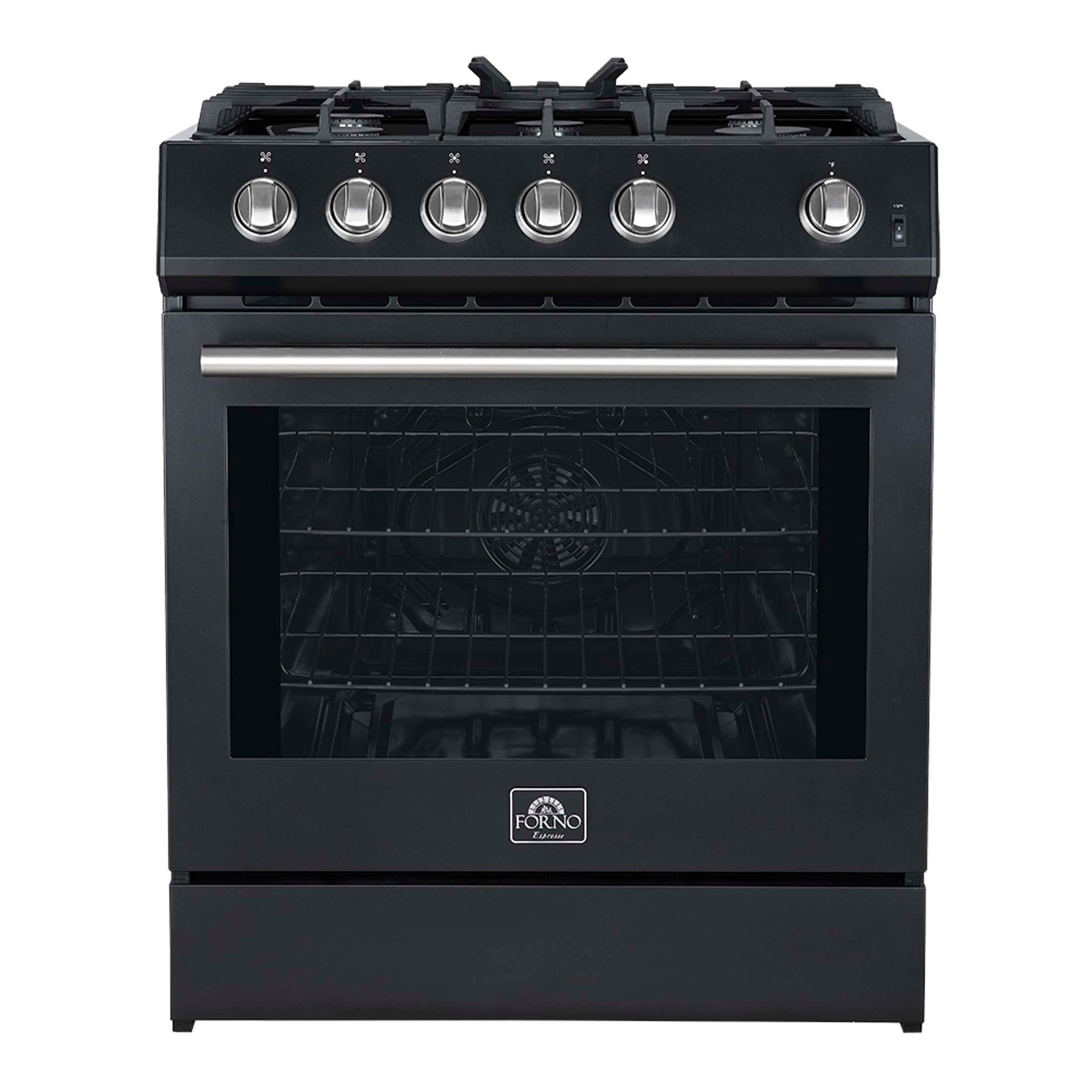 The Forno Leonardo 30" gas range in black combines modern design with professional-grade performance. Its powerful cooktop delivers 39,500 BTU across continuous cast iron grates, providing stability and effortless cookware movement. The deep recessed black enamel surface simplifies cleanup, keeping spills contained. The spacious 5.0 cu. ft. convection oven offers 22,500 BTU of broil and bake power, with two adjustable rack heights and a high-powered convection fan for even heat distribution. Designed for reliability, the auto re-ignition feature ensures consistent performance, while natural gas compatibility and an included propane conversion kit provide flexible installation options.