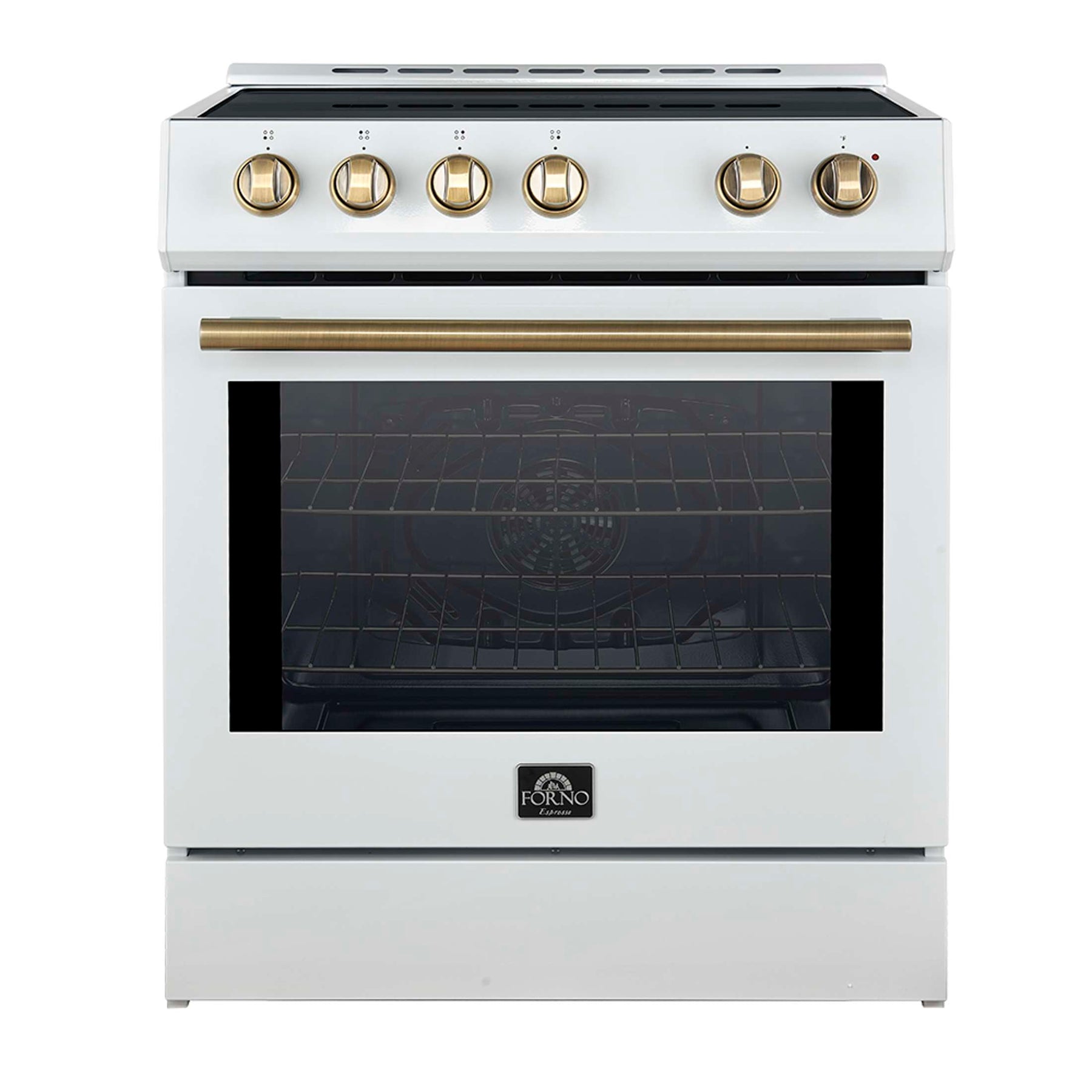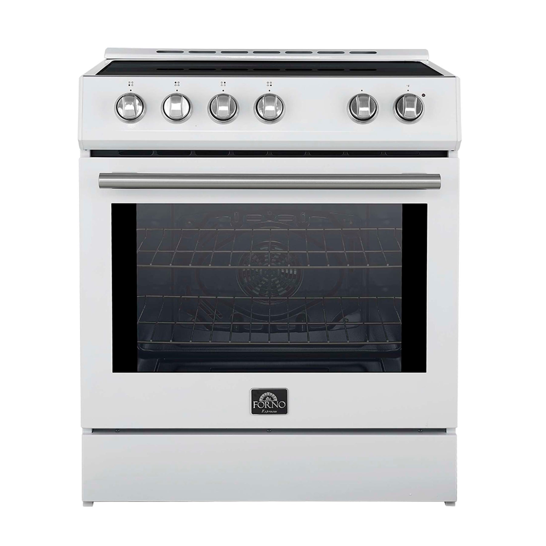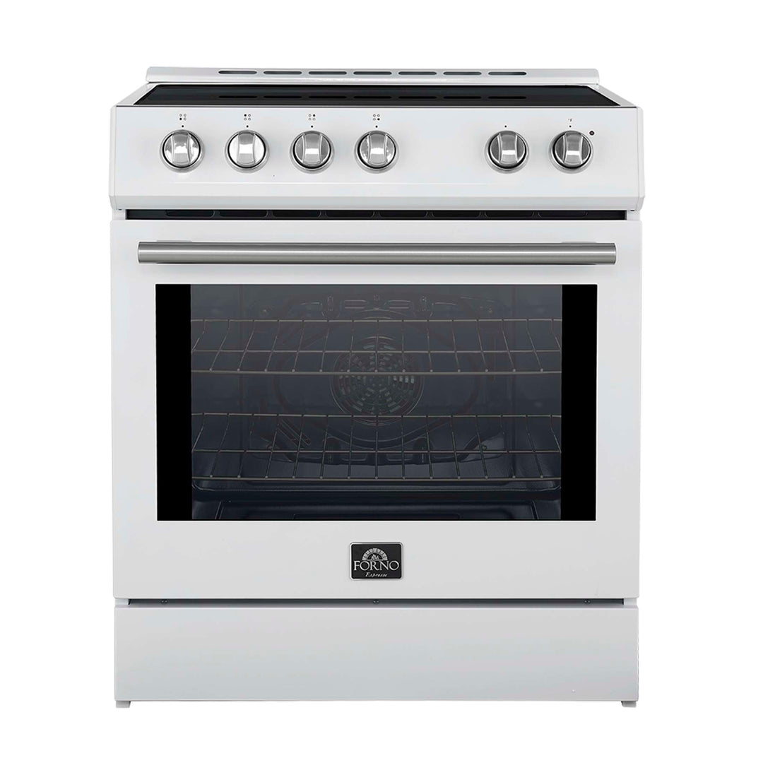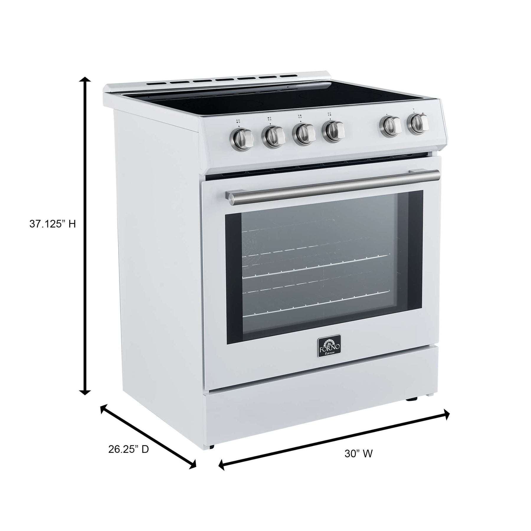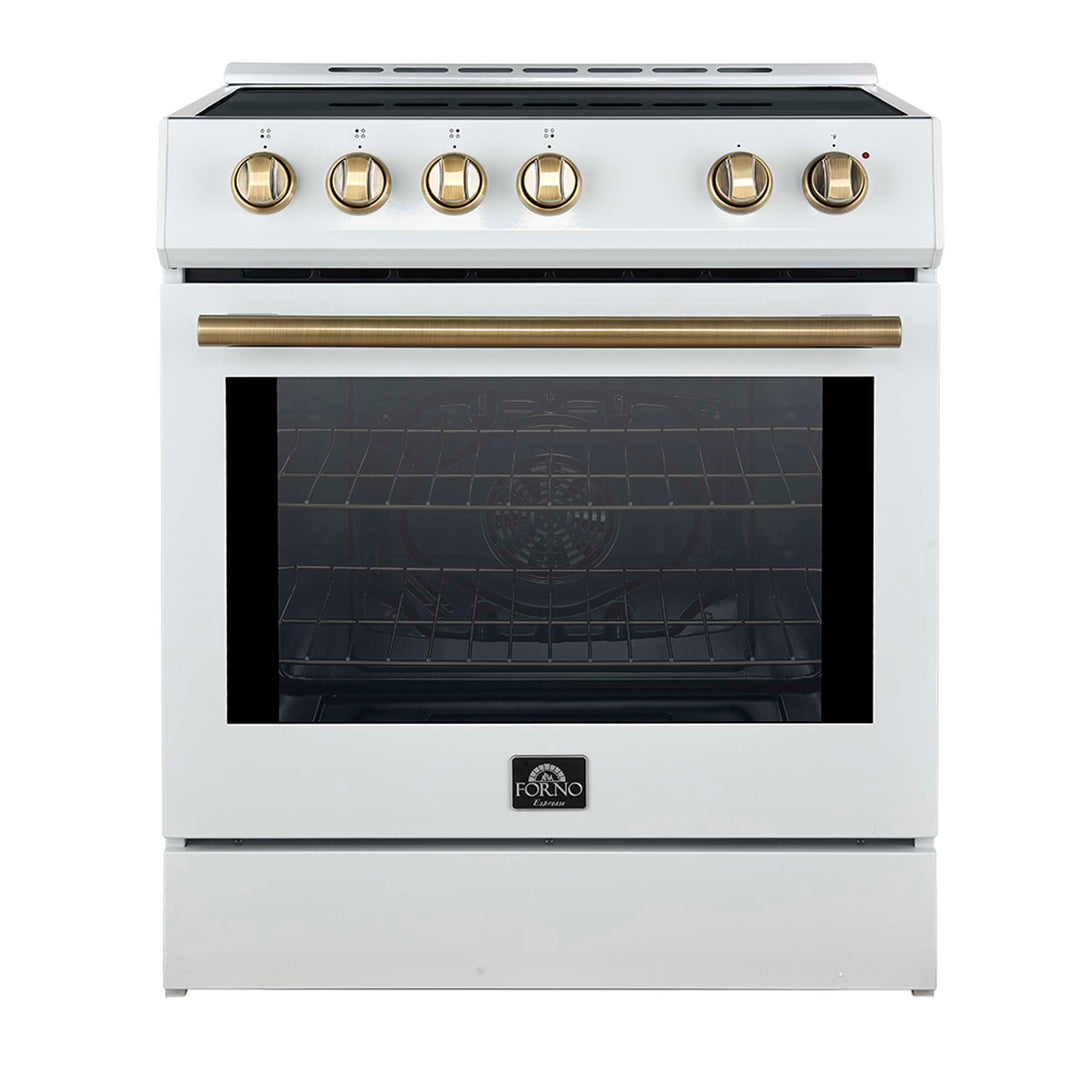 The Forno Leonardo Espresso 30" induction range in white delivers powerful, energy-efficient cooking with a sleek, modern design. Featuring 8,100-watt induction elements, this range provides rapid, precise heating for faster cooking and consistent results. The spacious 5.0 cu. ft. convection oven, equipped with a high-performance fan and 3,500-watt broil and bake output, ensures even heat distribution for perfect baking and roasting. Its speckled blue enamel interior enhances heat retention, while two adjustable oven racks offer versatility for any meal. Built for durability and ease of use, friction-resistant hinges ensure smooth operation, and the hidden bake element simplifies cleaning by preventing spills from burning.