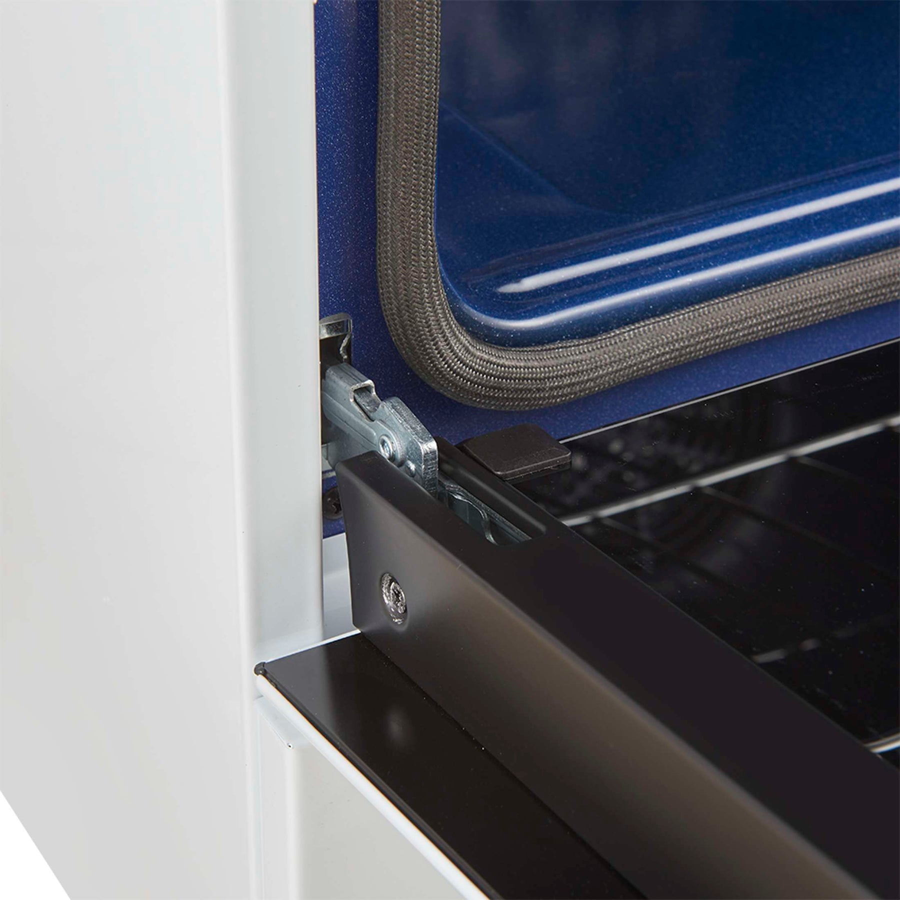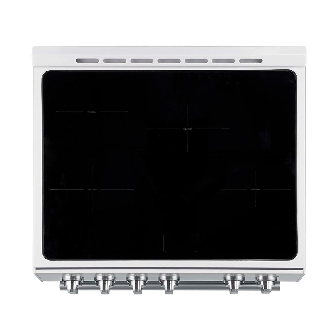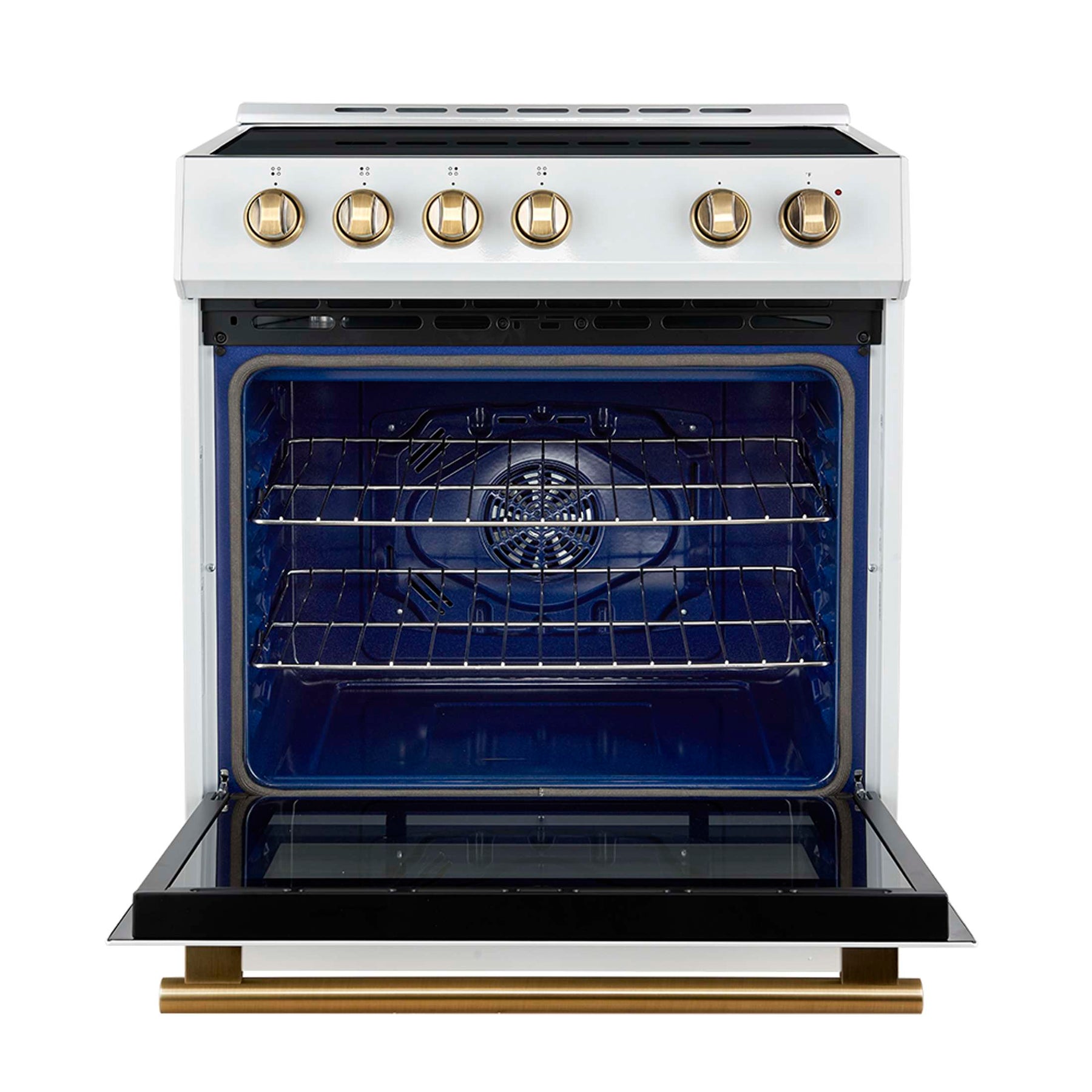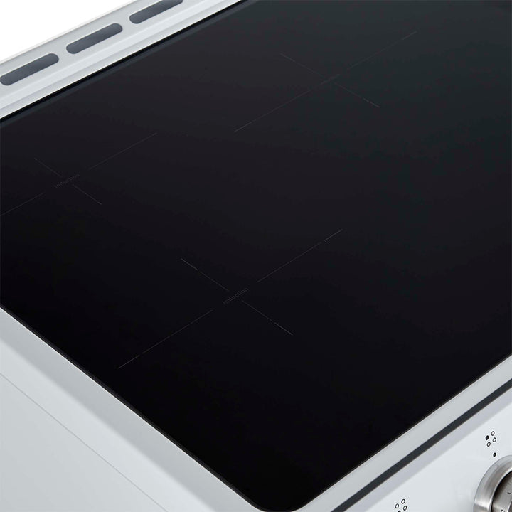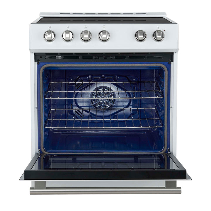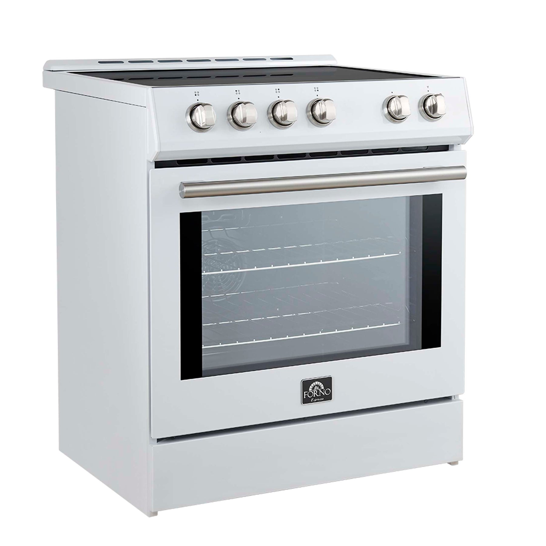 The Forno Leonardo Espresso 30" induction range in white delivers powerful, energy-efficient cooking with a sleek, modern design. Featuring 8,100-watt induction elements, this range provides rapid, precise heating for faster cooking and consistent results. The spacious 5.0 cu. ft. convection oven, equipped with a high-performance fan and 3,500-watt broil and bake output, ensures even heat distribution for perfect baking and roasting. Its speckled blue enamel interior enhances heat retention, while two adjustable oven racks offer versatility for any meal. Built for durability and ease of use, friction-resistant hinges ensure smooth operation, and the hidden bake element simplifies cleaning by preventing spills from burning.