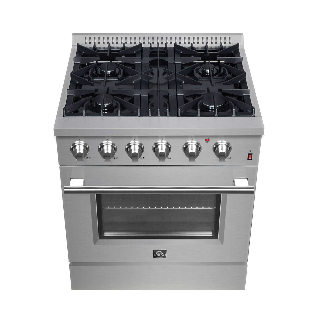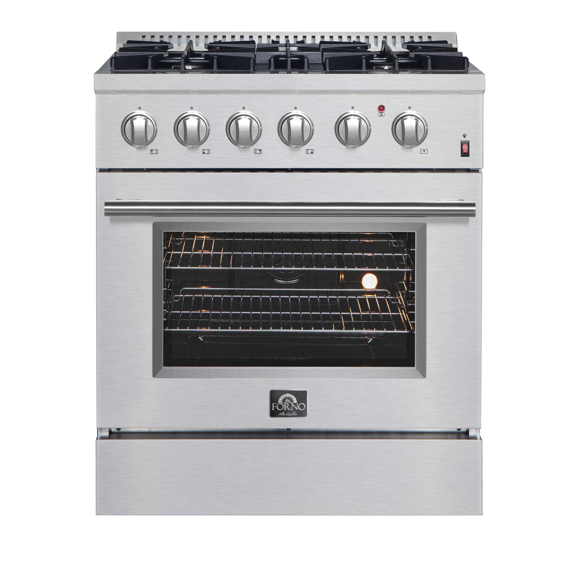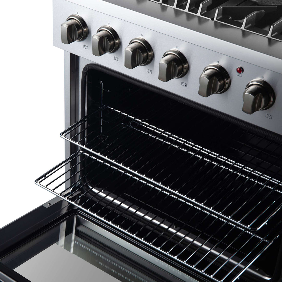 The Marco 30" Alta Qualita Dual Fuel Range brings a blend of professional style and performance to your kitchen, featuring a robust stainless-steel design. Its 4 sealed burners, including a powerful dual-ring burner for boiling or searing, provide a total output of 37,000 BTU, with the added ability to simmer for delicate tasks like melting chocolate or sauces. The 30-inch true convection oven offers a 4.32 cu. ft. capacity, 3,600 watts of combined broil and bake output, and a durable 3-layer glass oven door for enhanced visibility. The 1,500-watt true convection element and fan ensure fast, precise temperature control for consistent cooking. The Marco includes 2 oven racks, a built-in temperature gauge and an LP conversion kit. Additionally, the zinc-coated metal knobs with bezel rings ensure lasting beauty. With its powerful performance, sleek design, and thoughtful features, this range elevates your cooking experience.