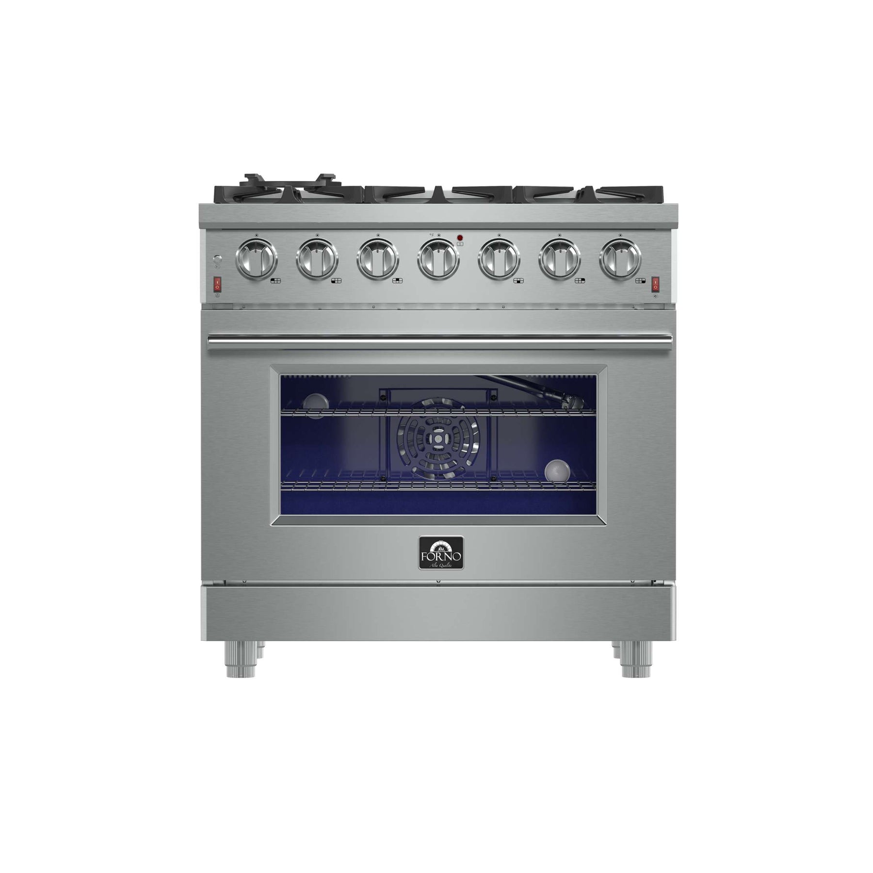 The Forno Massimo 36 Inch Gas Range harmonizes professional style and 304-grade stainless steel durability. Its 6 sealed burners, totaling 83,000 BTU, include a precision 20,000 BTU dual-ring burner that can simmer at 1,000 BTU. Continuous cast iron grates ensure stability on the enamel surface. The 5.36 cu.ft. convection oven, with a blue enamel interior and 3-layer glass window, reaches 30,000 BTU for versatile cooking. It features 2 telescopic racks, an air fryer kit, a wok support, a reversible griddle, an LP conversion kit, and durable zinc-coated metal knobs. Elevate your kitchen with performance, convenience, and enduring elegance.