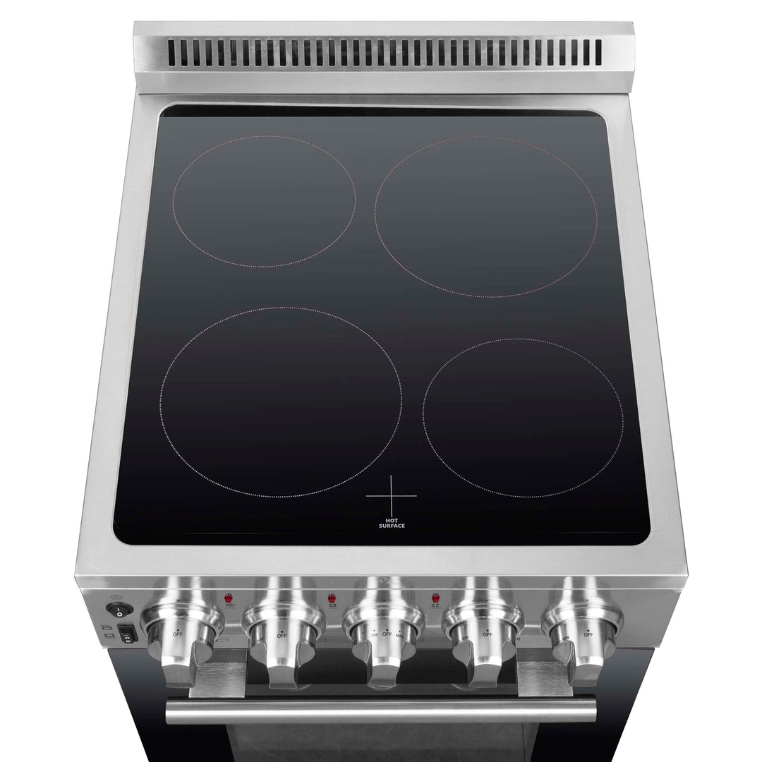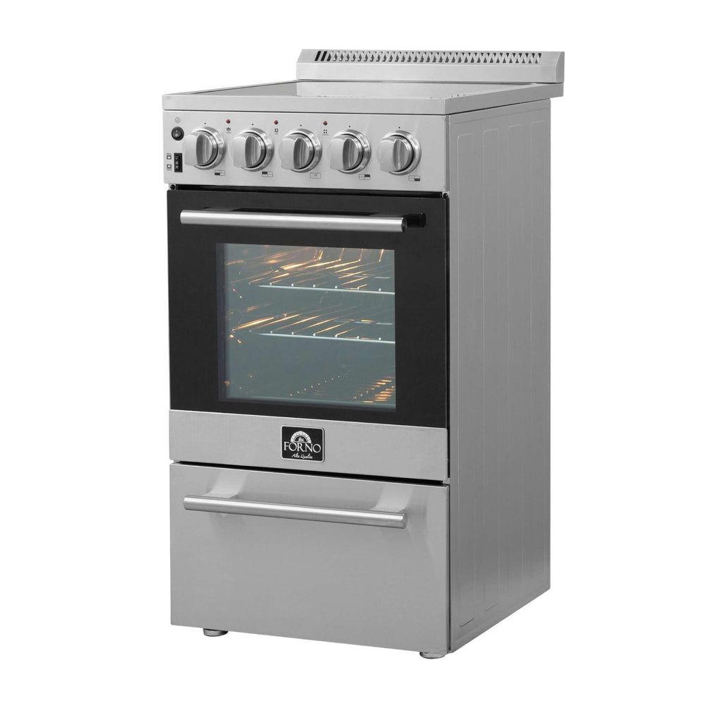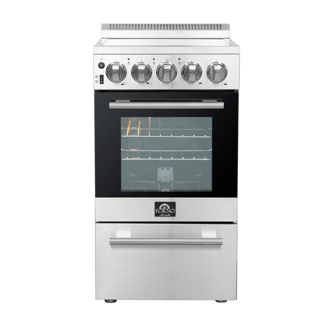 The Forno Pallerano 20 Inch Electric Range is a compact, high-performance solution for small kitchens. The oven features a hidden bake element and single-element broiler with 2,100 W of max power, perfect for everyday cooking and baking. With 2.05 cu. ft. of oven capacity, a 6,000 W cooktop, and a convenient storage drawer, this electric range combines functionality and space-saving design. Ideal for apartments, condos, and secondary kitchens.