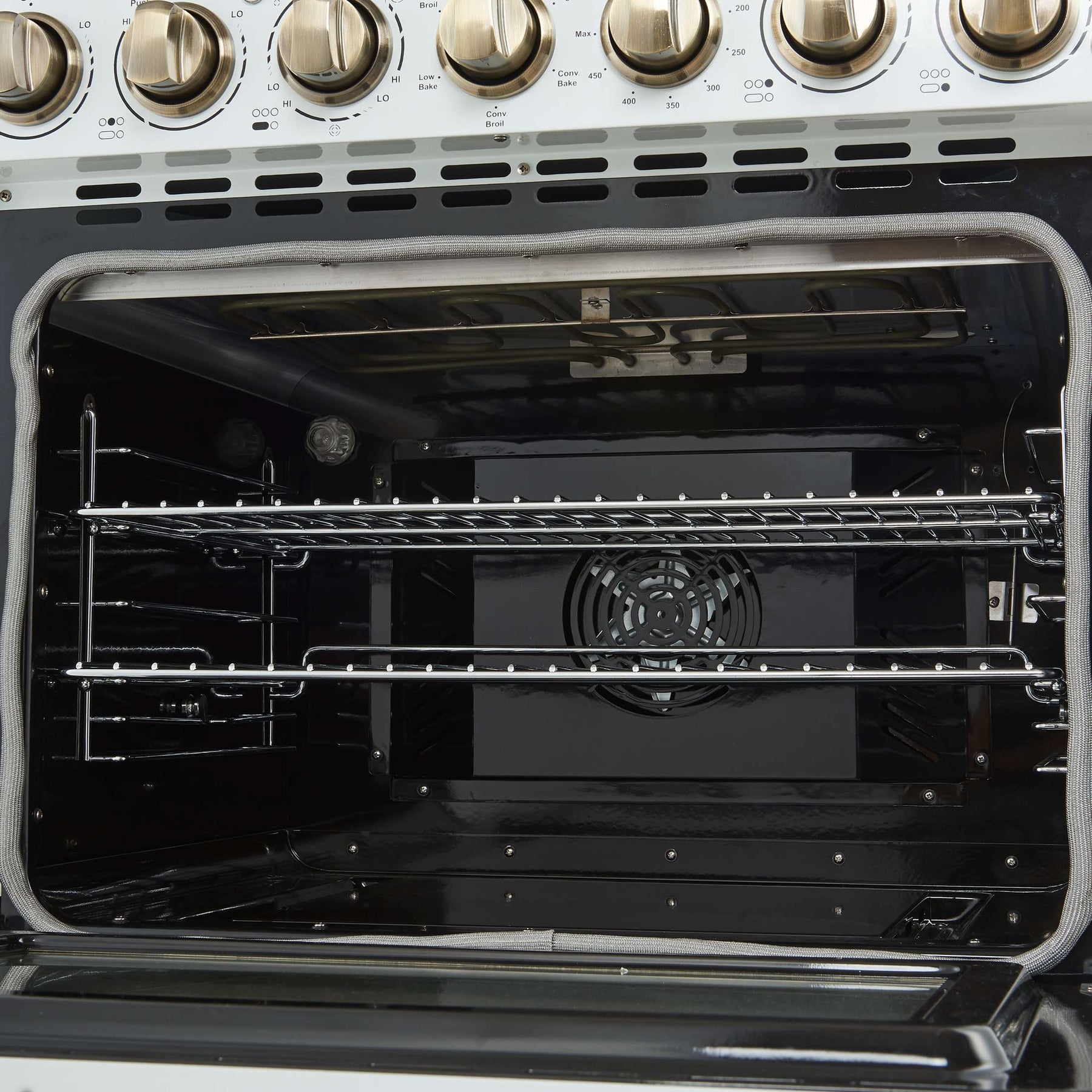 The Forno Paolo 30" Freestanding Electric Range in white delivers powerful performance and modern style. Its smooth ceramic glass cooktop evenly distributes heat across five radiant elements with a total output of 7,800 watts. The 4.38 cu. ft. true convection oven, powered by a 1,200-watt convection fan and a 3,800-watt bake and broil system, ensures faster, more consistent cooking. A hidden bake element simplifies maintenance, while bright halogen lighting and a large viewing window let you monitor dishes without releasing heat. Designed for versatility, this range also includes a 100-watt warming zone and a dual-element broiler for precise, high-heat cooking.