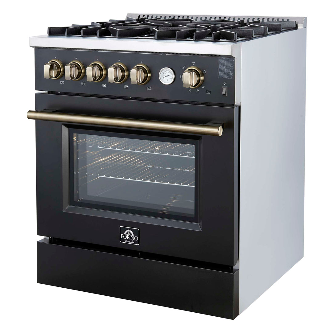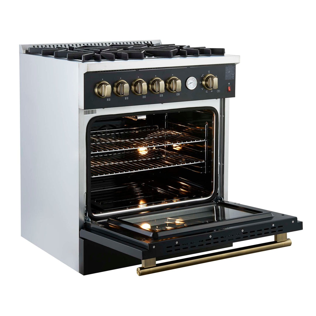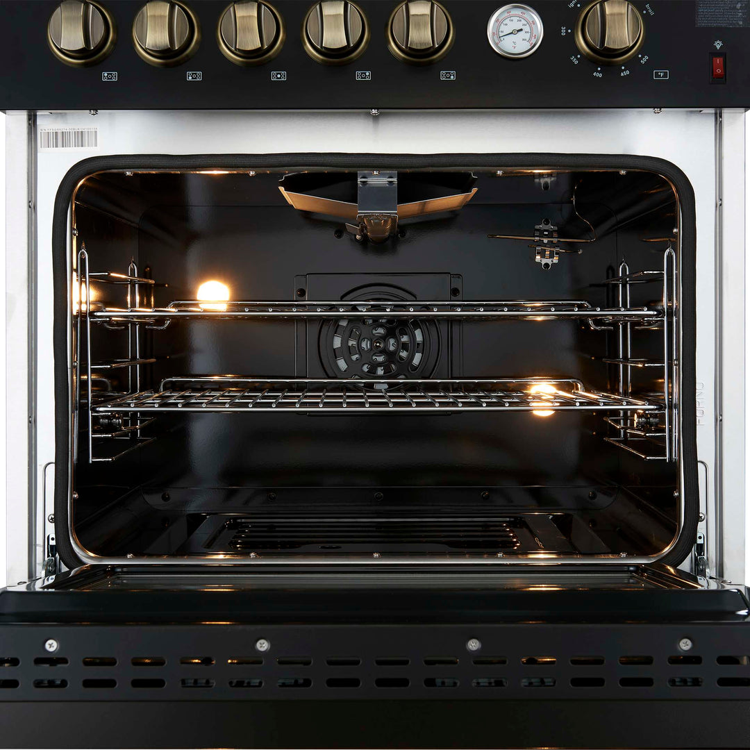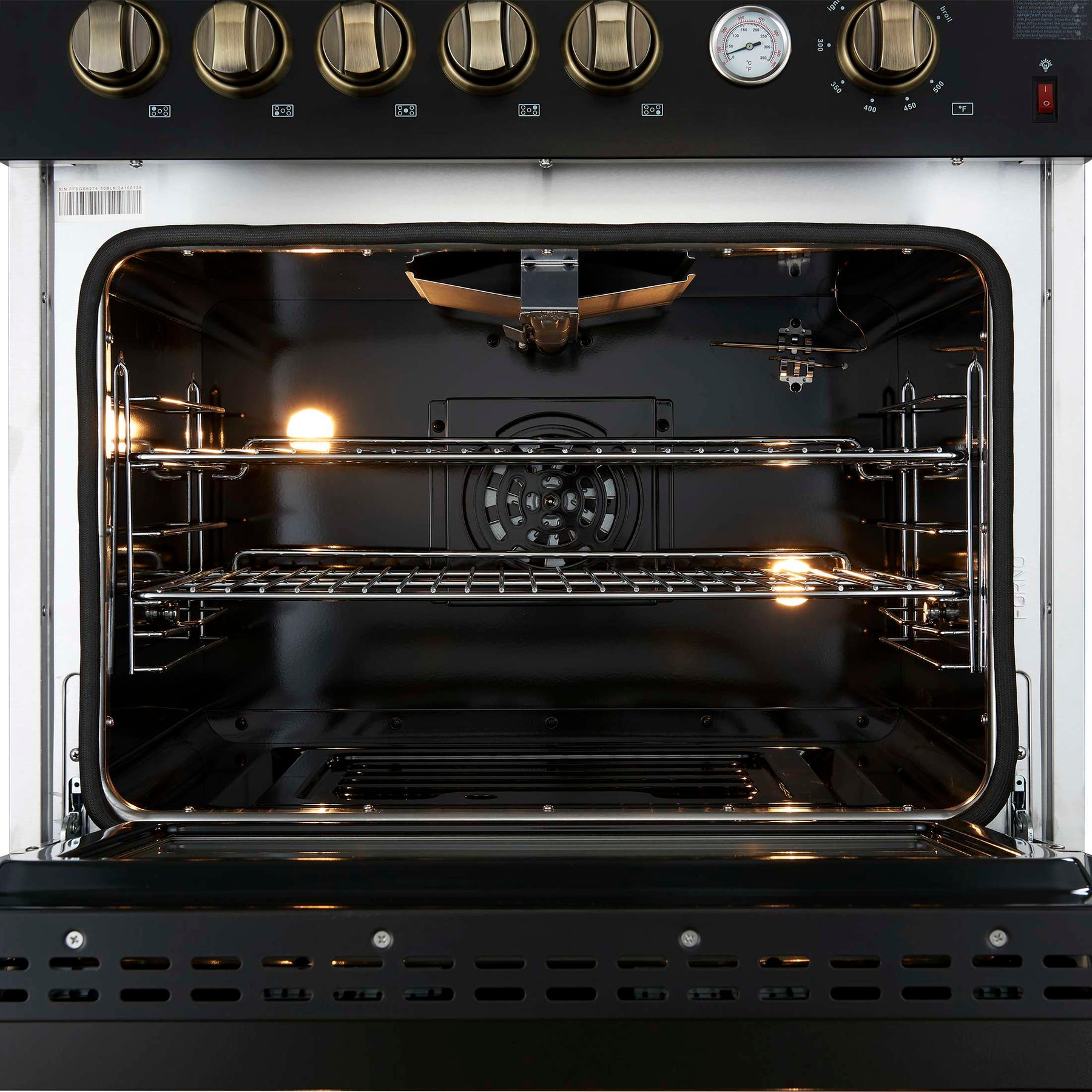 Elevate your cooking experience with the Giovanni 30" Alta Qualita Gas Range. Perfect for passionate home chefs, this range features five sealed burners delivering 67,000 BTU of power, including a dual-ring burner ideal for both intense searing and delicate simmering. The spacious 4.32 cu. ft. convection oven ensures even cooking, whether you're baking a family favorite or roasting a holiday meal. Accessories such as the air fryer basket and reversible griddle offer unmatched versatility, while the sleek black color adds a professional touch to your kitchen. Zinc-coated metal knobs with bezel rings are built to stay beautiful for years, adding a touch of lasting elegance to your kitchen.