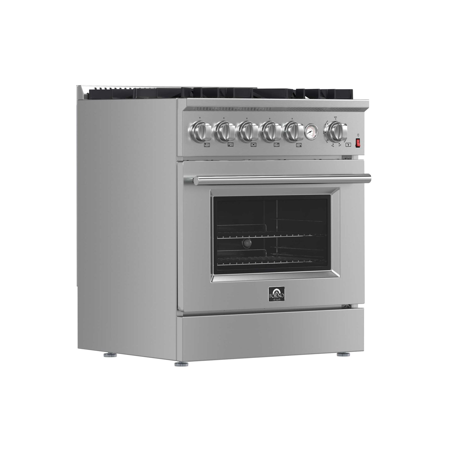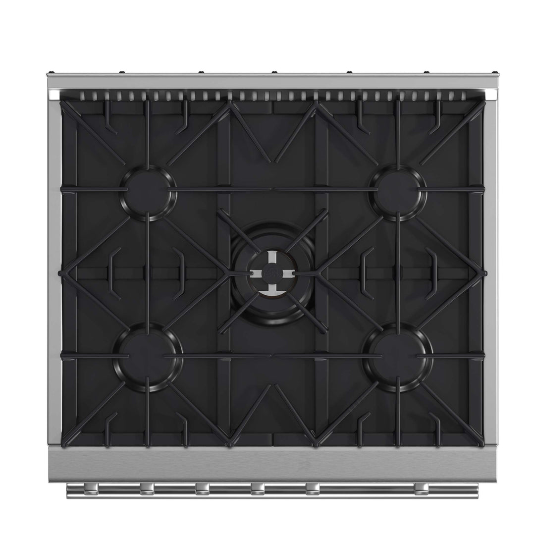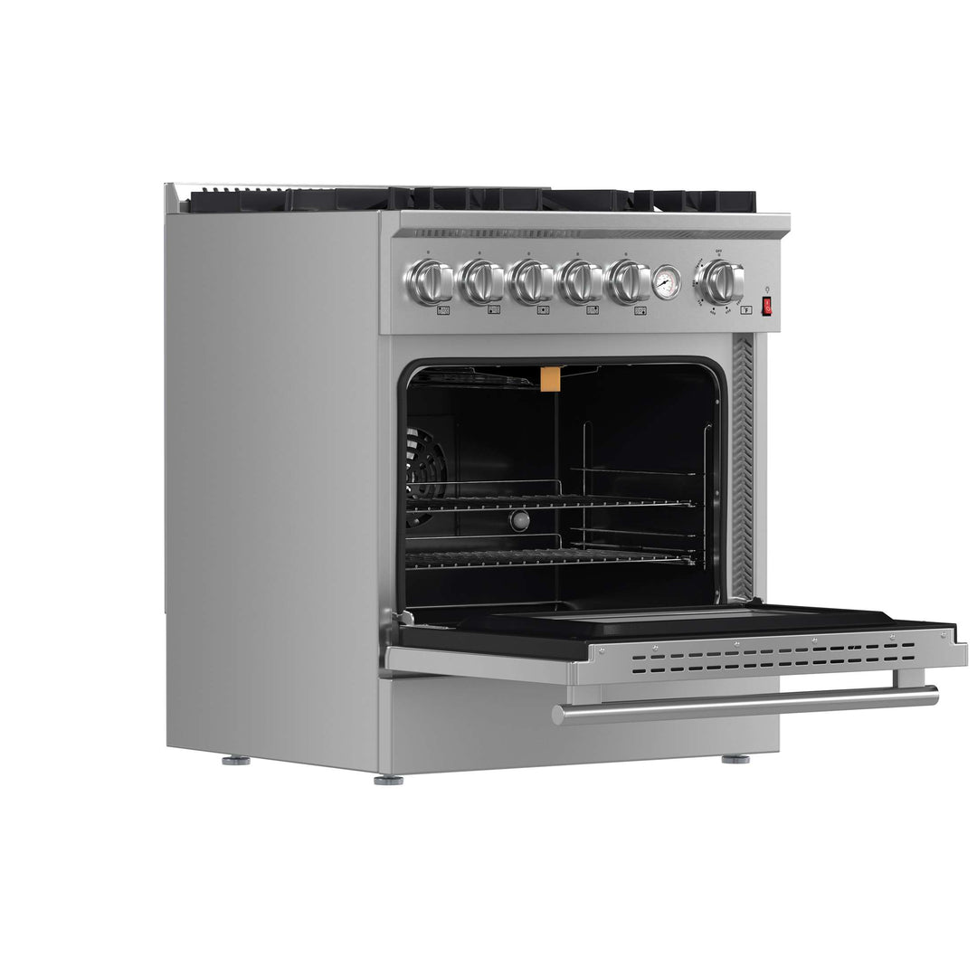 Elevate your cooking experience with the Giovanni 30" Alta Qualita Gas Range. Perfect for passionate home chefs, this range features five sealed burners delivering 67,000 BTU of power, including a dual-ring burner ideal for both intense searing and delicate simmering. The spacious 4.32 cu. ft. convection oven ensures even cooking, whether you're baking a family favorite or roasting a holiday meal. Accessories such as the air fryer basket and reversible griddle offer unmatched versatility, while the stainless-steel design adds a professional touch to your kitchen. Zinc-coated metal knobs with bezel rings are built to stay beautiful for years, adding a touch of lasting elegance to your kitchen.