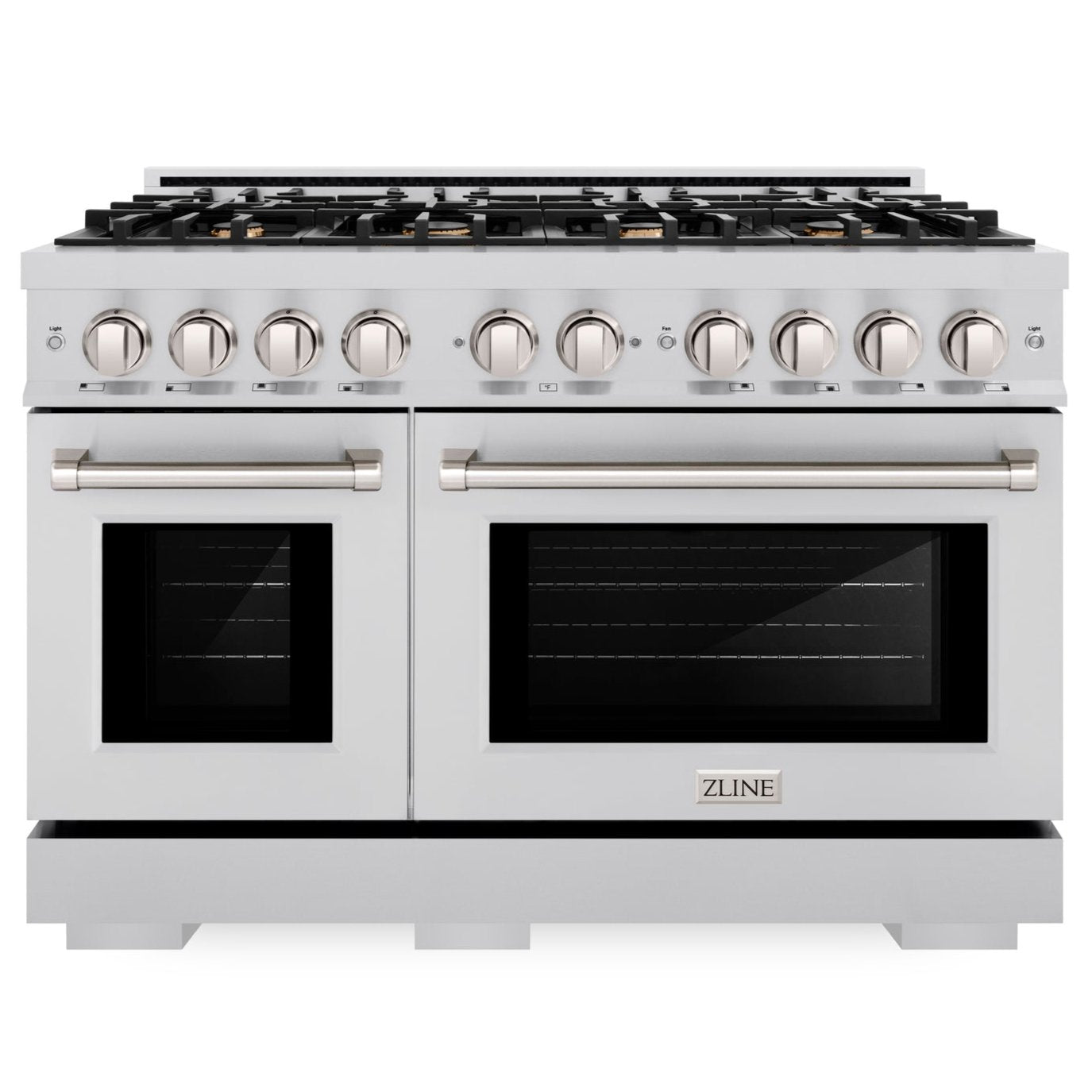 The ZLINE 48" 6.7 cu. ft. Select Double Oven Dual Fuel Range in Stainless Steel with 8 Brass Burners (HDR-BR-48) combines the elegance of a hand-finished porcelain gas cooktop with 8 Italian-made brass auto-reignition burners, a large electric convection oven with an energy-efficient cooling fan to ensure quiet operation, a small bake-and-broil oven, and Horizon oven door window designs allowing you to master every meal. With a modern, timeless style and refined functionality, ZLINE Select Dual Fuel Ranges are masterfully crafted to deliver an elevated culinary experience.