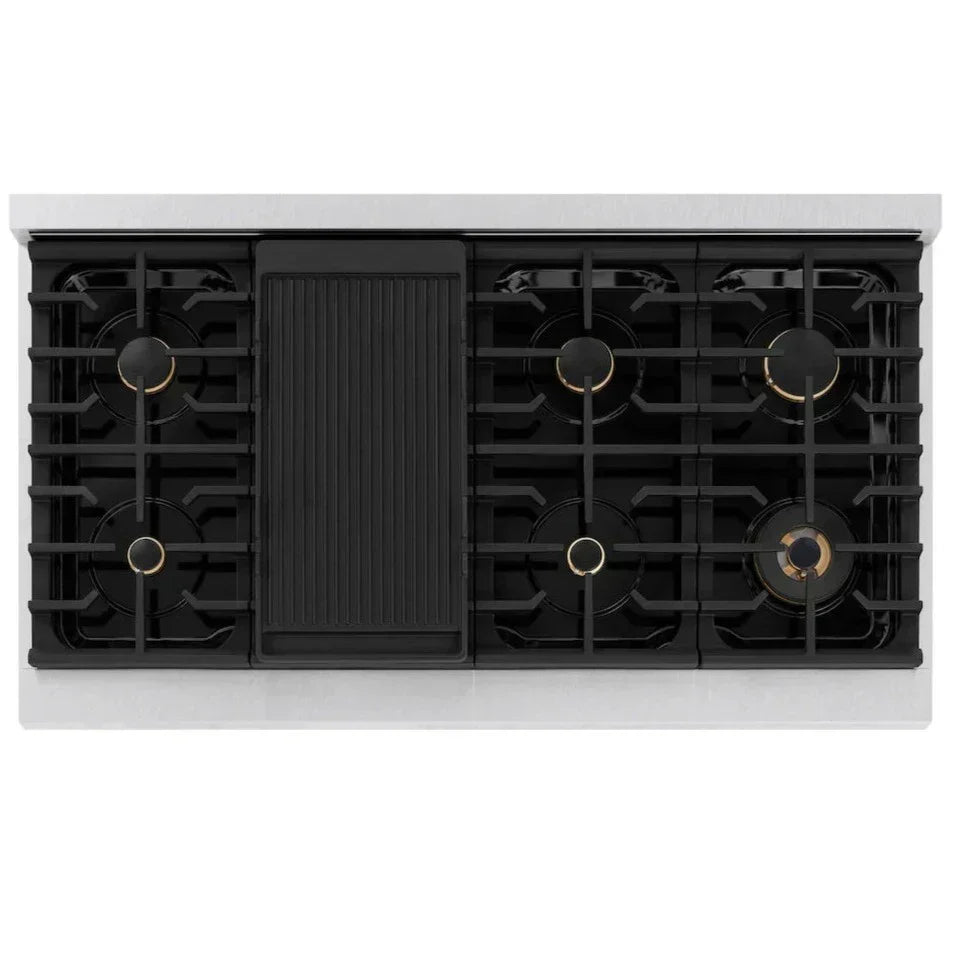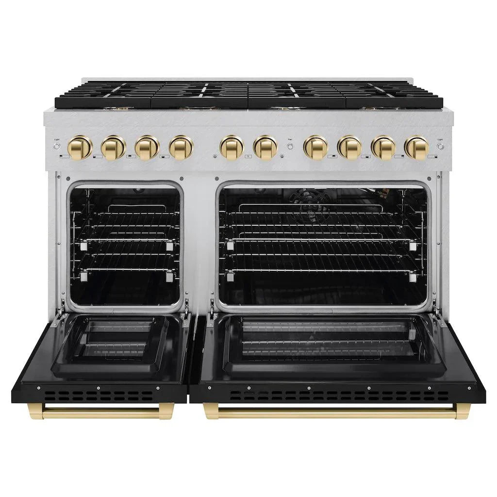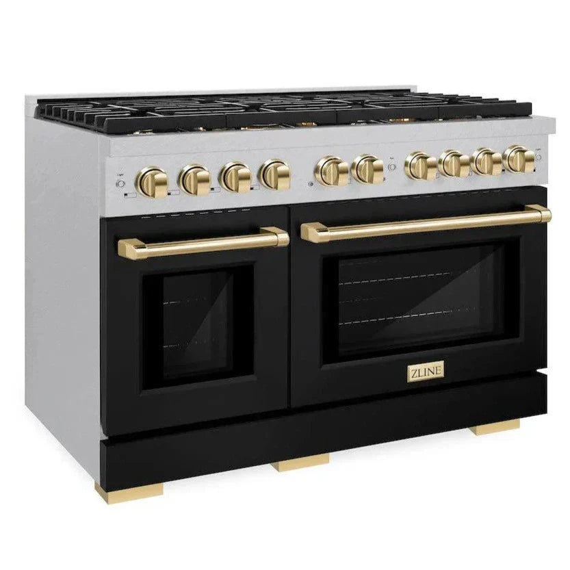 Experience the epitome of luxury with the ZLINE Paramount Edition 48" 6.7 cu. ft. Double Oven Gas Range in DuraSnow® Stainless Steel (SGRSZ-BLM-48-D), boasting a versatile gas cooktop with 8 Italian-made burners and a spacious gas convection oven. Complete with sleek black matte doors and elegant gold accents, this range offers both style and functionality for a truly elevated cooking experience.