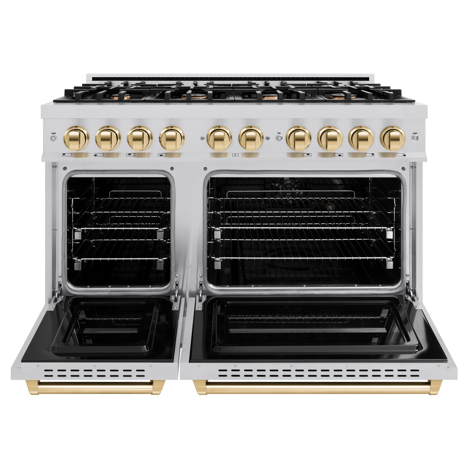 The ZLINE Autograph Edition 48" 6.7 cu. ft. Classic Double Oven Dual Fuel Range with 8 Burner Gas Cooktop in Stainless Steel and Polished Gold Accents (CDRZ-48-G) combines the elegance of a hand-finished porcelain gas cooktop with 8 Italian-made auto-reignition burners, a large electric convection oven with an energy-efficient cooling fan to ensure quiet operation, a small bake-and-broil oven, Landscape oven door window designs, and stunning polished gold knobs and handles allowing you to master every meal. With a modern, timeless style and refined functionality, ZLINE Classic Dual Fuel Ranges are masterfully crafted to deliver an elevated culinary experience.