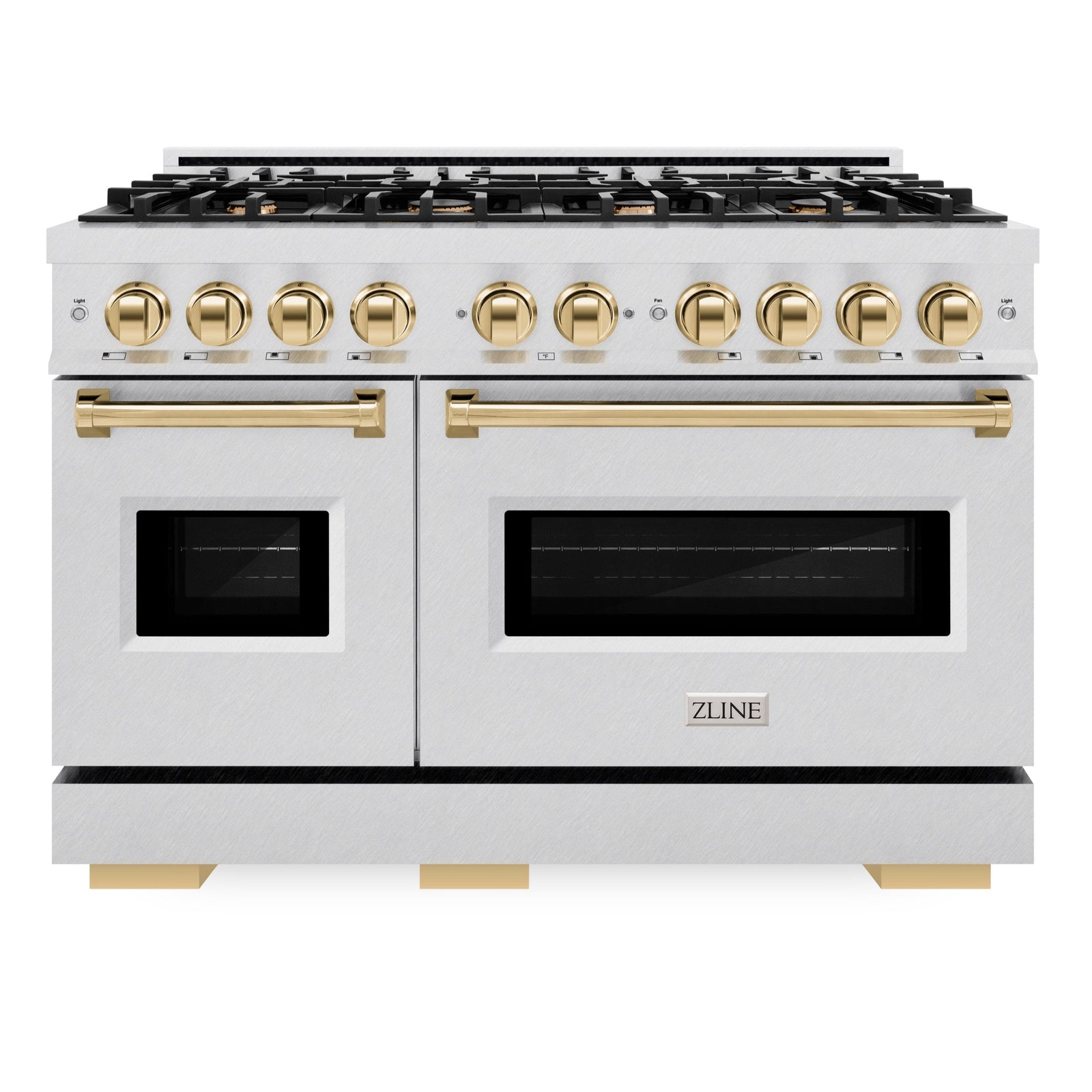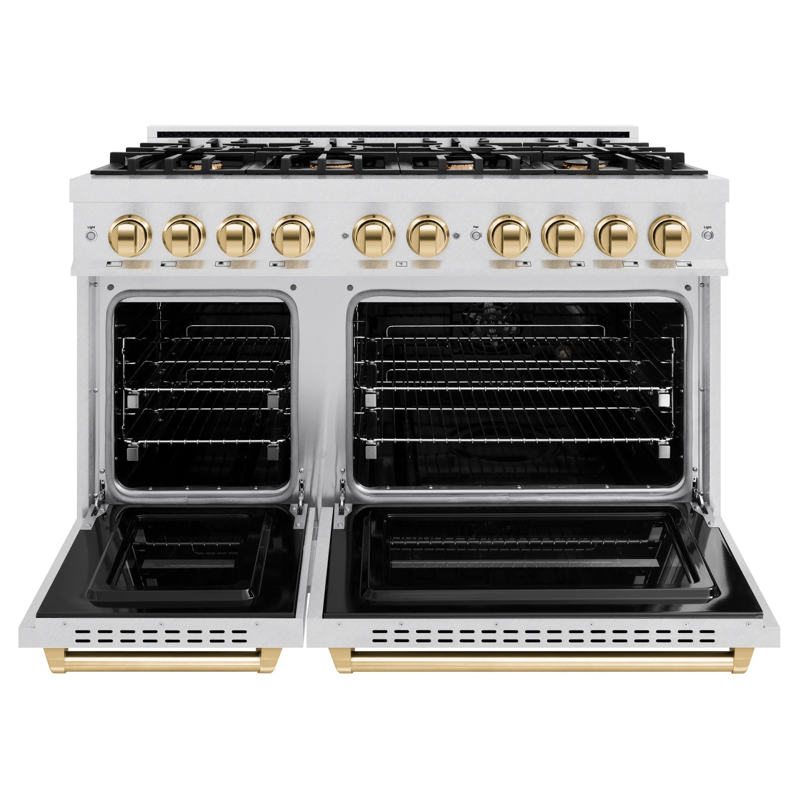 The ZLINE Autograph Edition 48" 6.7 cu. ft. Classic Double Oven Gas Range with 8 Burner Cooktop in DuraSnow Stainless Steel and Polished Gold Accents (CGRSZ-48-G) combines the elegance of a hand-finished porcelain gas cooktop with 8 Italian-made auto-reignition burners, a large gas convection oven with an energy-efficient cooling fan to ensure quiet operation, a small baking oven, Landscape oven door window designs, and stunning polished gold knobs and handles allowing you to master every meal. With a modern, timeless style and refined functionality, ZLINE Classic Gas Ranges are masterfully crafted to deliver an elevated culinary experience.