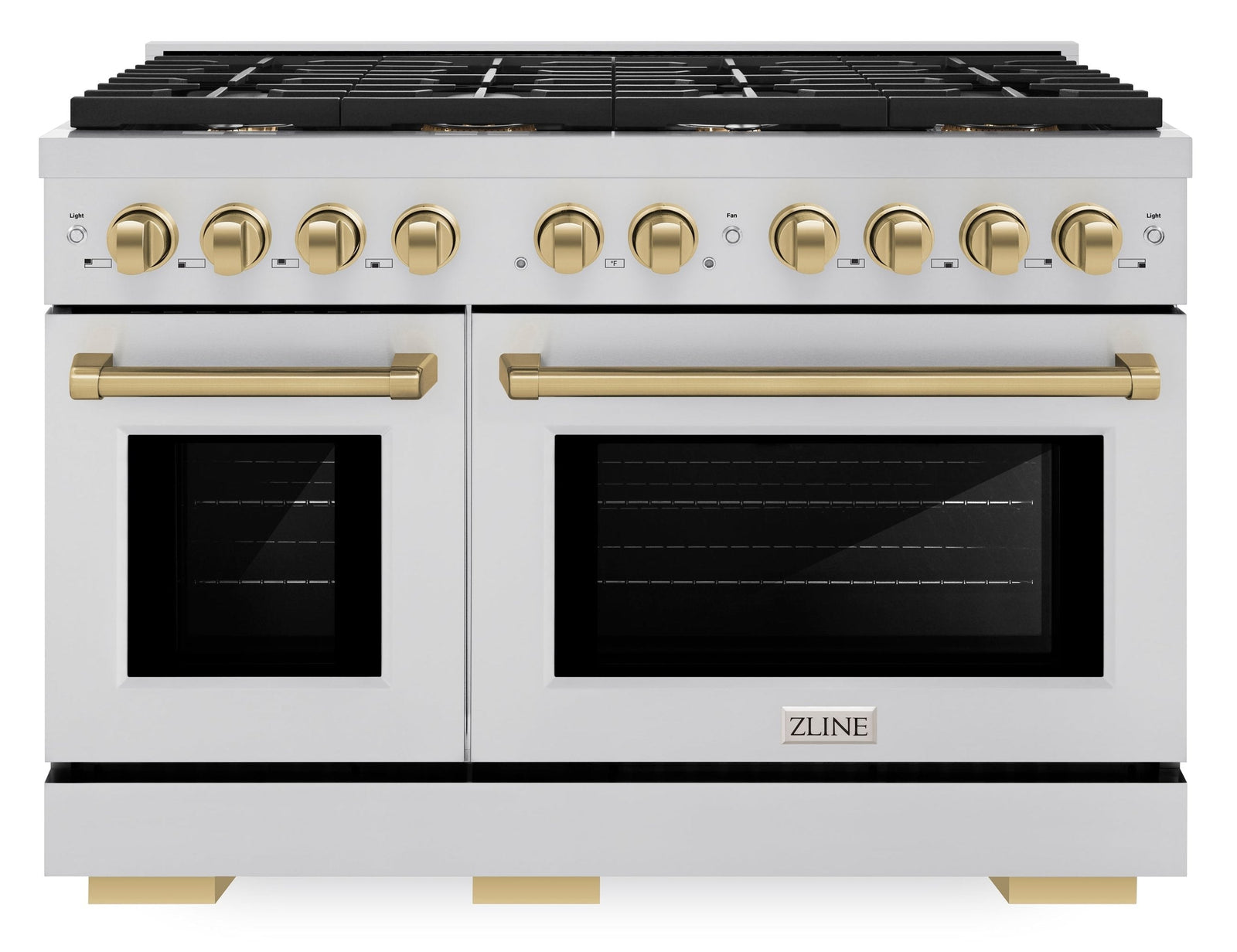 The ZLINE Autograph Edition 48" 6.7 cu. ft. Paramount Dual Fuel Range offers a blend of gas and electric cooking capabilities with an electric convection oven, automatic reignition burners, and advanced temperature control technology. This range also features sturdy cast iron grates and a Horizon oven door window design. Designed with a contemporary, timeless aesthetic and superior functionality, the ZLINE Paramount Dual Fuel Range delivers an exceptional culinary performance.