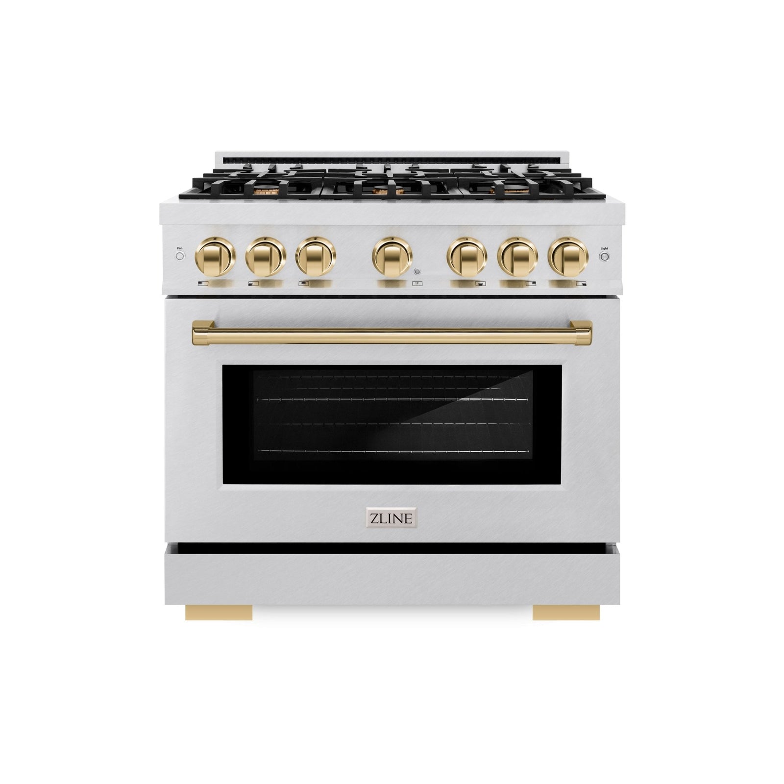 ZLINE Autograph Edition 36 in. 5.2 cu. ft. Select Dual Fuel Range with 6 Burner Gas Cooktop and Electric Convection Oven in Satin Stainless Steel with Polished Gold Accents (HDRSZ-36-G)