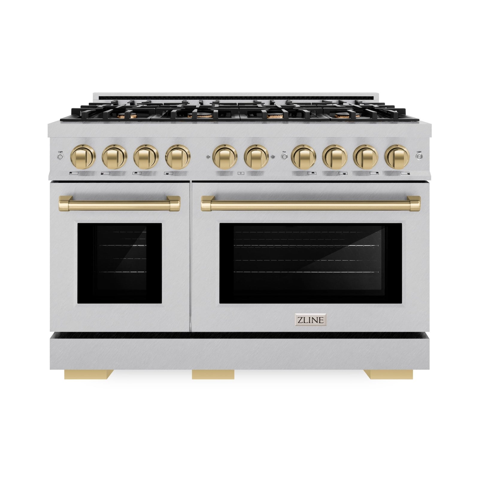 ZLINE Autograph Edition 48 in. 6.7 cu. ft. Select Double Oven Dual Fuel Range with 8 Burner Gas Cooktop in Satin Stainless Steel and Champagne Bronze Accents (HDRSZ-48-CB)