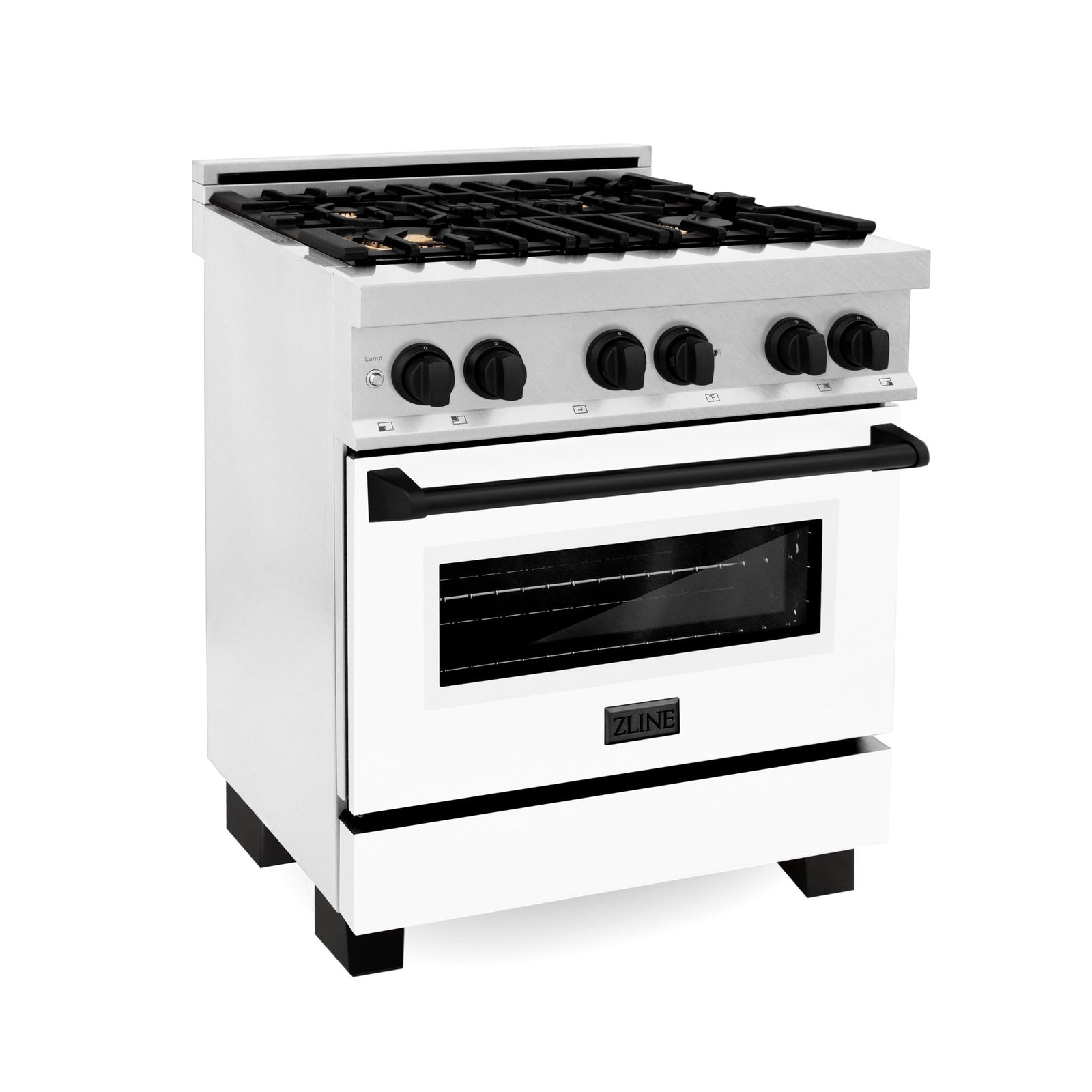 ZLINE Autograph Edition 30 in. 4.0 cu. ft. Legacy Dual Fuel Range with 4 Burner Gas Cooktop and Electric Convection Oven in Satin Stainless Steel with White Matte Door and Matte Black Accents (RASZ-WM-30-MB)