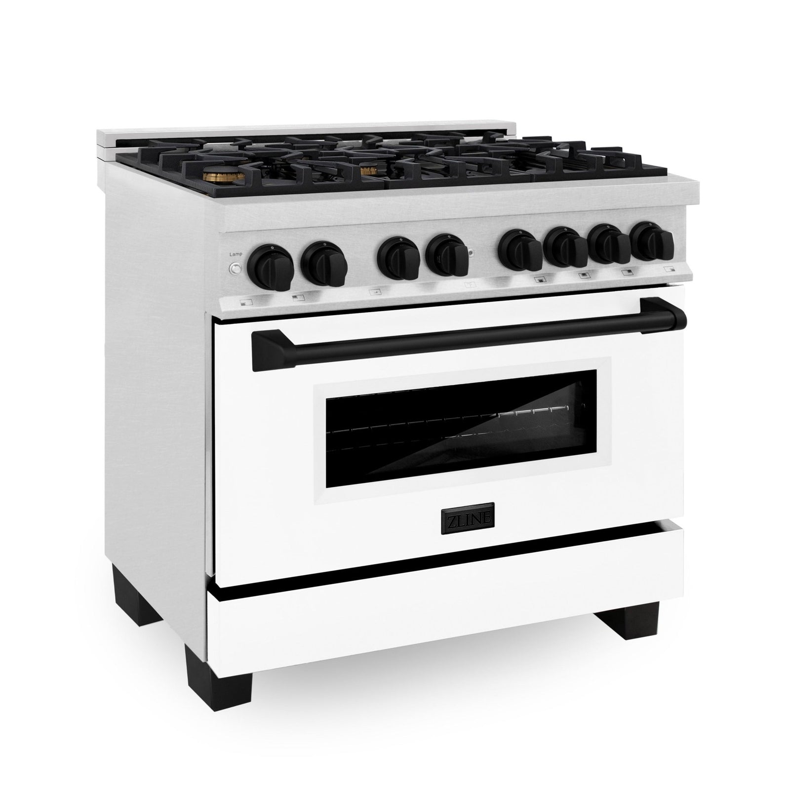 ZLINE Autograph Edition 36 in. 4.6 cu. ft. Legacy Dual Fuel Range with 6 Burner Gas Cooktop and Electric Convection Oven in Satin Stainless Steel with White Matte Door and Matte Black Accents (RASZ-WM-36-MB)