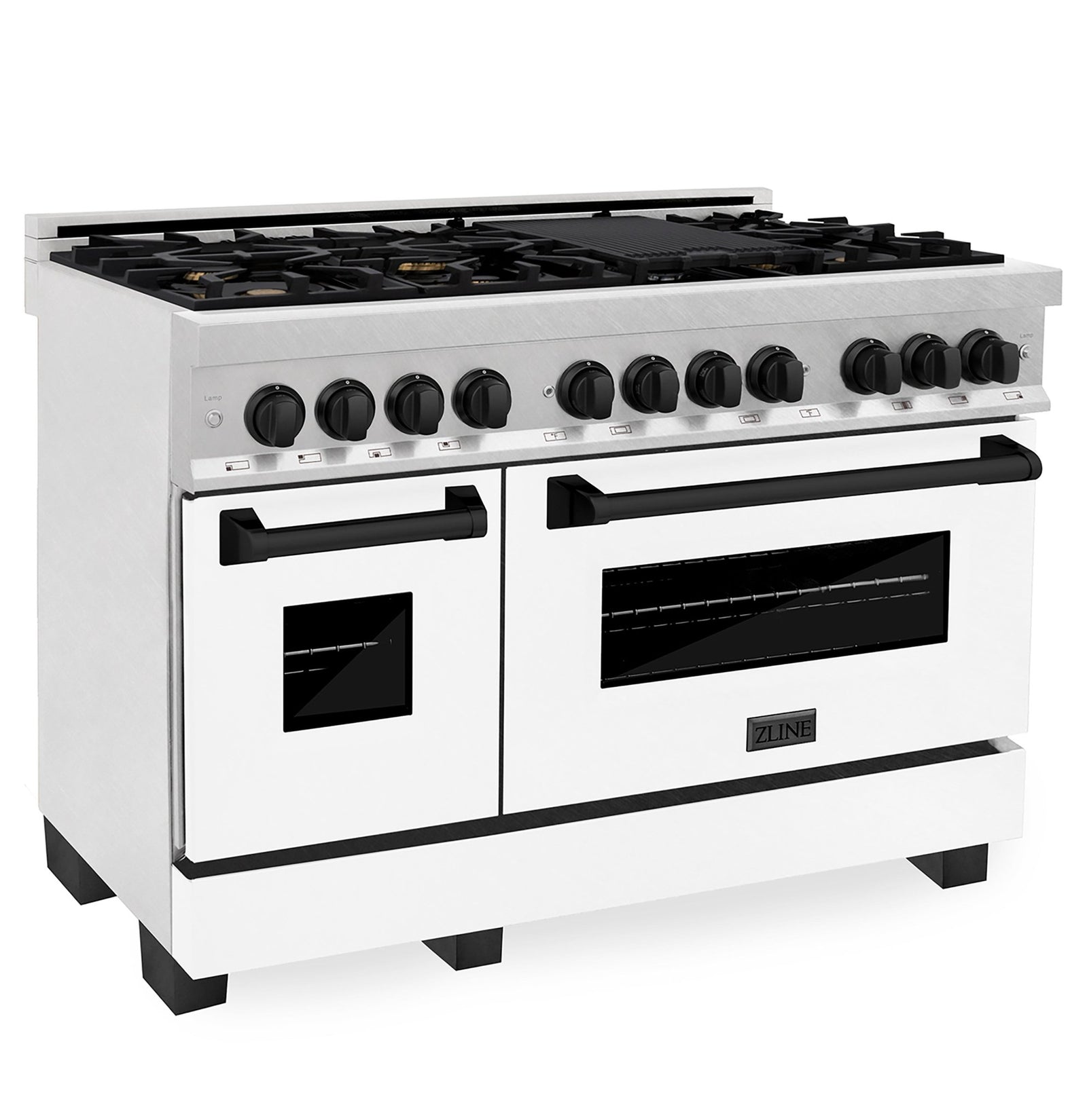 ZLINE Autograph Edition 48 in. 6.0 cu. ft. Legacy Dual Fuel Range with 7 Burner Gas Cooktop and 2 Electric Ovens in Satin Stainless Steel with White Matte Doors and Matte Black Accents (RASZ-WM-48-MB)