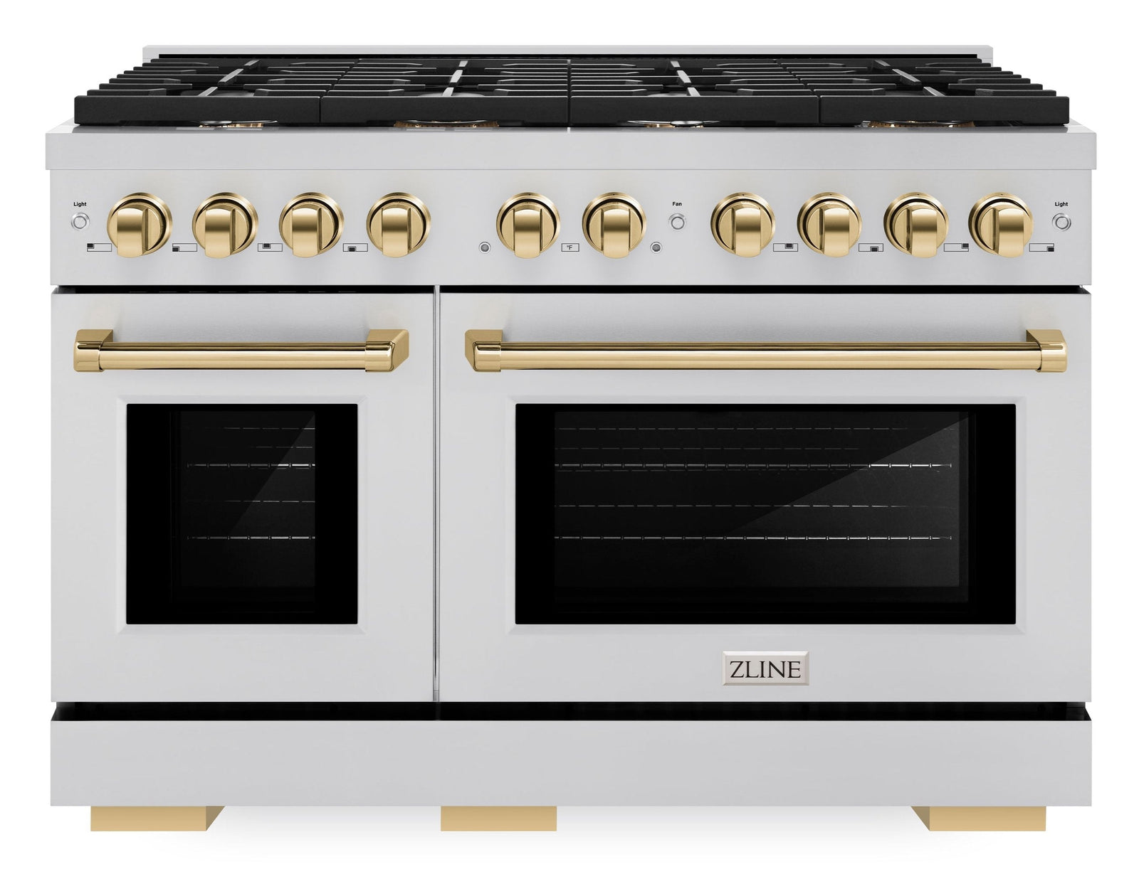 ZLINE Autograph 48" 6.7 cu. ft. Paramount Double Oven Dual Fuel Range with 8 Burners in Stainless Steel and Polished Gold Accents, SDRZ-48-G