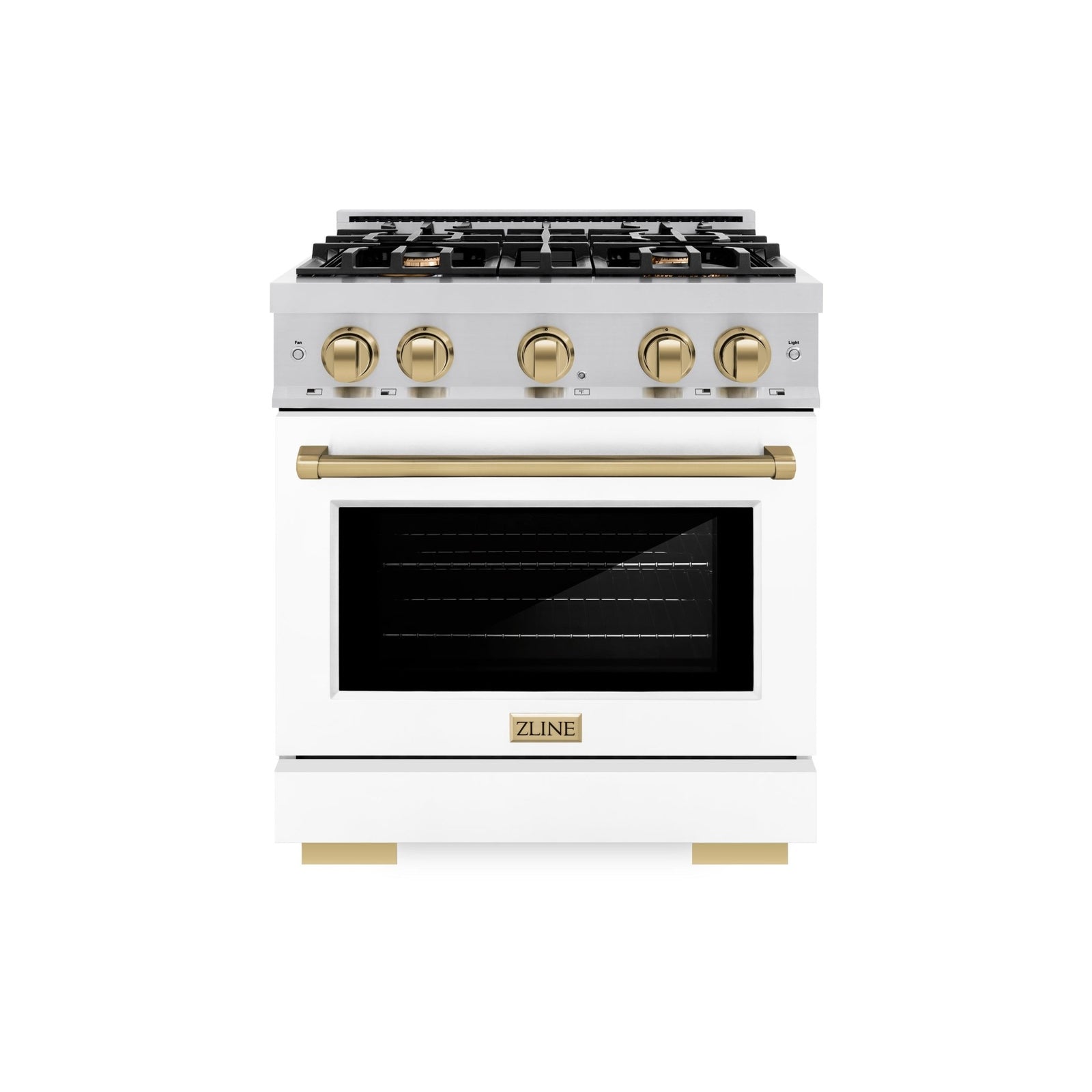 ZLINE Autograph Edition 30 in. 4.2 cu. ft. Select Gas Range with 4 Burner Cooktop and Convection Gas Oven in Satin Stainless Steel with White Matte Door and Champagne Bronze Accents (HGRSZ-WM-30-CB)