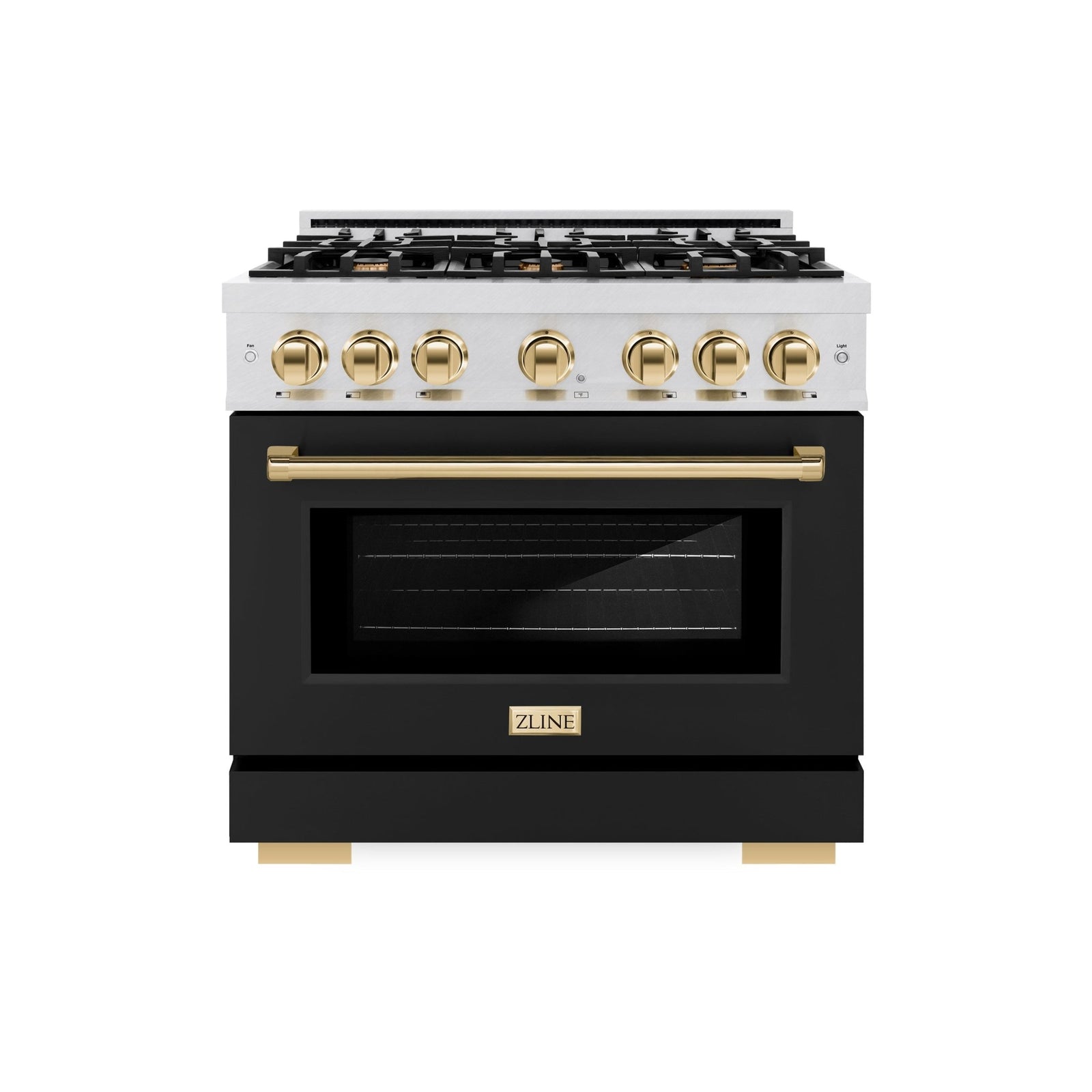 ZLINE Autograph Edition 36 in. 5.2 cu. ft. Select Gas Range with 6 Burner Cooktop and Convection Gas Oven in Satin Stainless Steel with Black Matte Door and Polished Gold Accents (HGRSZ-BLM-36-G)