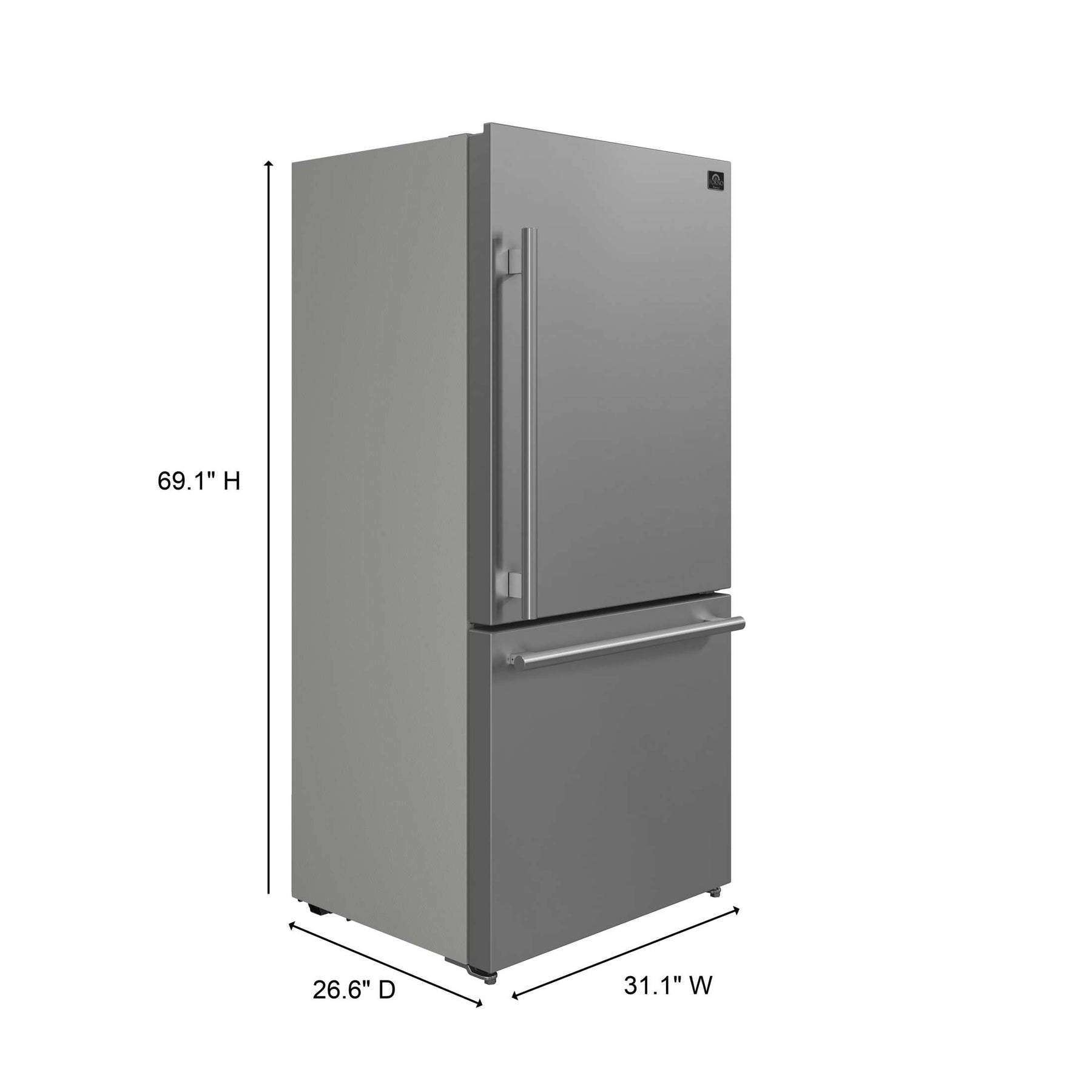Introducing the FORNO 31 Inch Milano Espresso Bottom Freezer Refrigerator, seamlessly blending style and functionality. Its compact 31-inch size and 17.2 cu ft capacity offer ample storage without compromising aesthetics. Two full-width freezer drawers optimize organization, while digital touch control ensures precise temperature settings and real-time monitoring. The fingerprint-resistant VCM door maintains a modern look effortlessly. Swift temperature adjustments with Super Cool and Super Freeze safeguard your groceries' quality. ENERGY STAR Certified for efficiency, and high-efficiency LED lighting reduces food spoilage. Adjustable features, including shelves, door bins, and a full-width crisper drawer, enhance user-friendliness. Upgrade your kitchen with this stylish, convenient, and fresh addition!