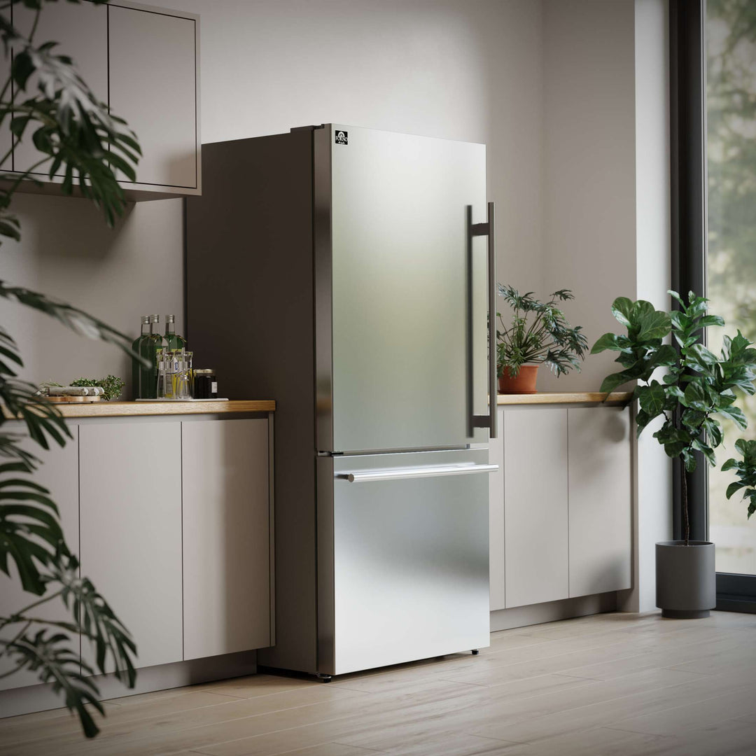 The Forno Espresso Milano 31" Bottom Freezer Refrigerator with Ice Maker offers 17.2 cu. ft. of efficient storage in a sleek, space-saving design. Two full-width freezer drawers provide easy organization for frozen foods, while digital touch controls ensure accurate temperature management. Super Cool and Super Freeze functions help lock in freshness faster. Energy Star Certified for efficiency, it also includes high-efficiency LED lighting to help reduce food spoilage. Adjustable shelves, door bins, and a full-width drawer make customizing storage simple and convenient.