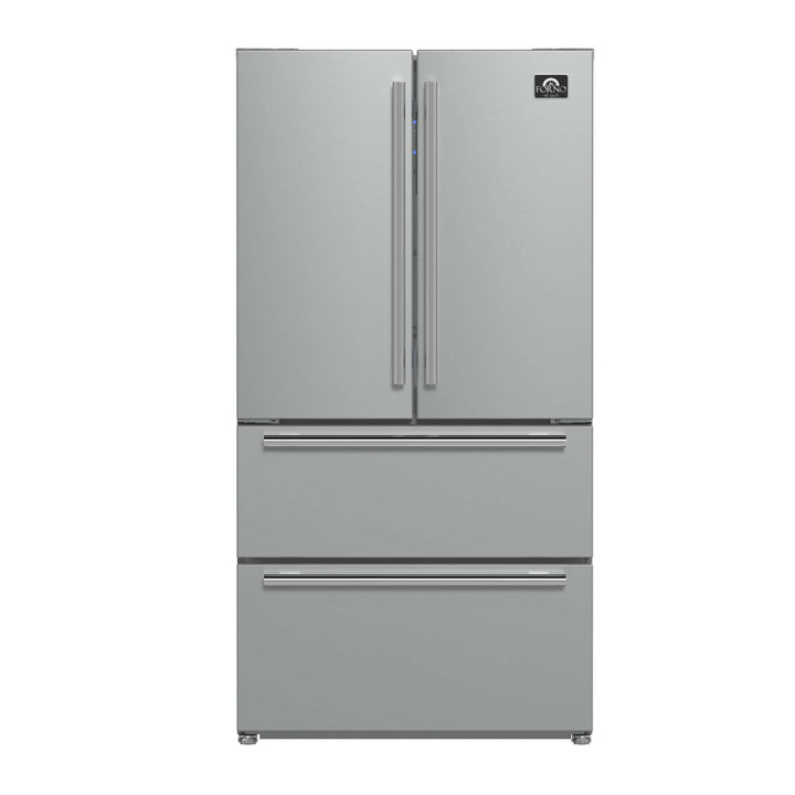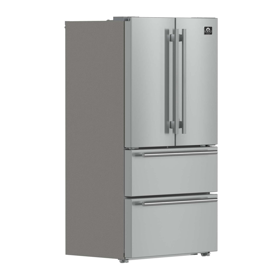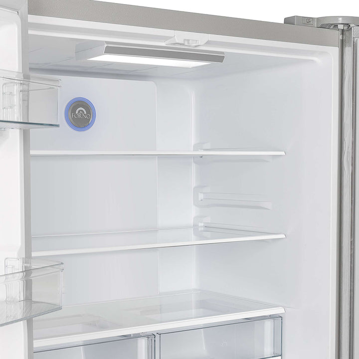 Upgrade your kitchen with the Forno Moena 36" French Door Refrigerator, designed for seamless integration and premium performance. Powered by a high-efficiency inverter compressor, it ensures energy savings, quiet operation, and precise temperature control to keep your food fresher for longer. The frost-free multi-airflow cooling system maintains consistent temperatures throughout its 19.2 cu. ft. capacity, providing optimal food preservation with adjustable shelving for versatile storage. The 12.1 cu. ft. fresh food section includes three glass shelves (two adjustable), two drawers, and generous door storage to keep groceries organized. The 7.2 cu. ft. freezer offers two pull-out drawers, a slide-out tray, and an automatic ice maker producing up to 4 pounds of ice daily, ensuring convenience for every occasion. With an intuitive LED touch panel, you can effortlessly control temperature settings and functions. Energy Star Certified, this built-in French door refrigerator operates efficiently while minimizing food spoilage with bright, high-efficiency LED lighting for superior visibility.