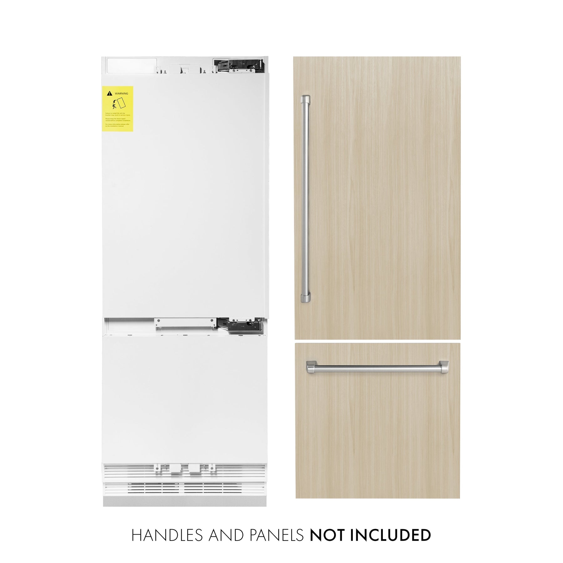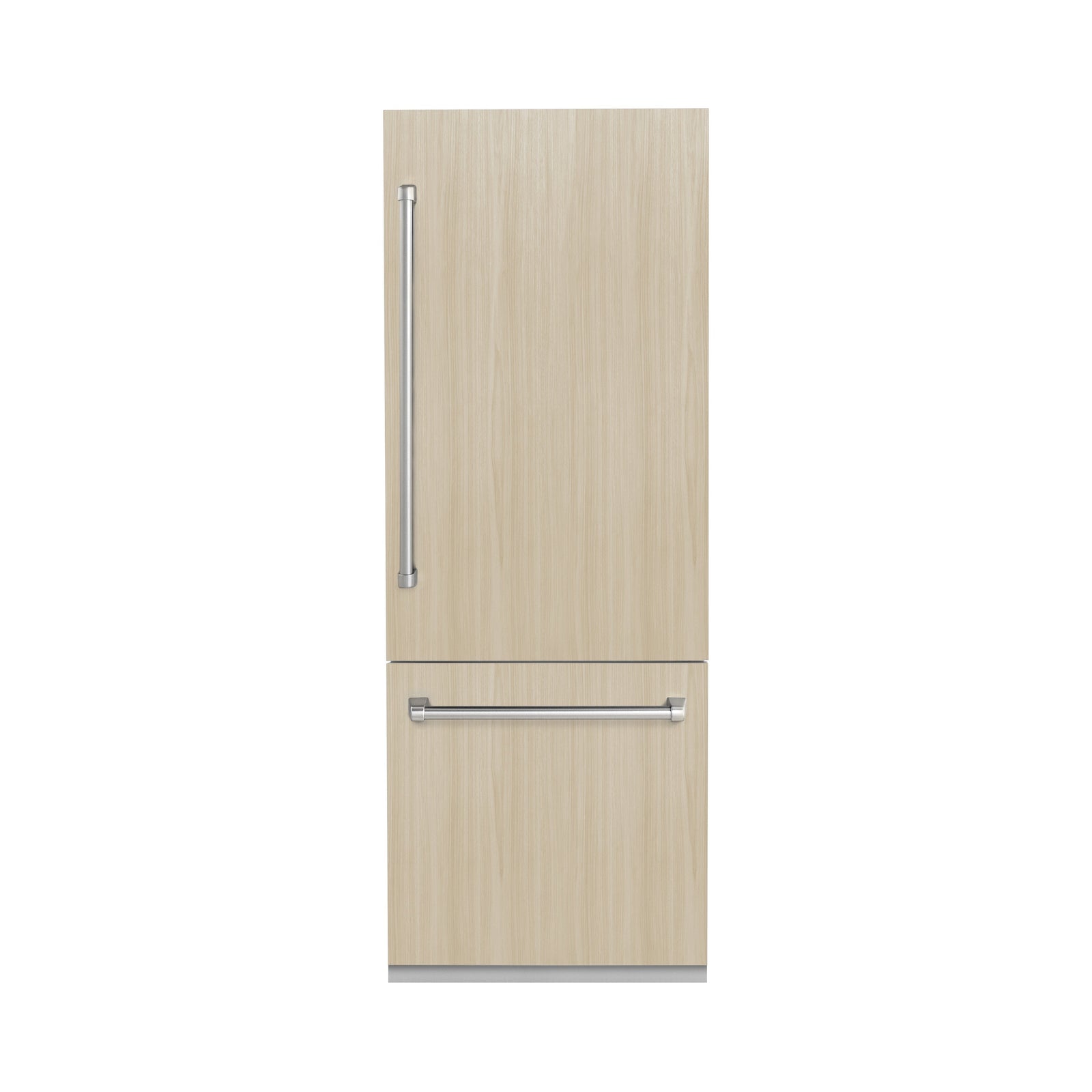 Enhance your kitchen with the ZLINE Autograph 30" 16.1 cu. ft. Built-In Panel-Ready 2-Door Bottom Freezer Refrigerator. This refrigerator combines high-quality performance with classic design, offering advanced capabilities such as adjustable temperatures, RapidChill Mode, and a concealed internal water and ice dispenser. Experience ZLINE's Attainable Luxury with this refrigerator, seamlessly blending innovation, elegance, and efficiency.