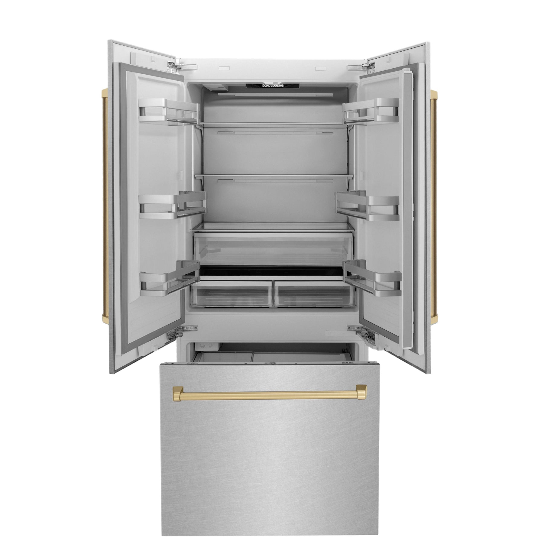 Enhance your kitchen with the ZLINE Autograph Durasnow 36" 19.6 cu. ft. Built-In 2-Door Bottom Freezer Refrigerator. This refrigerator combines high-quality performance with classic design, offering advanced capabilities such as adjustable temperatures, RapidChill Mode, and a concealed internal water and ice dispenser. Experience ZLINE's Attainable Luxury with this refrigerator, seamlessly blending innovation, elegance, and efficiency.
