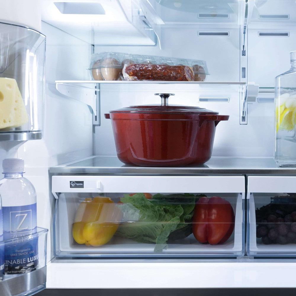 This ZLINE Autograph 36" 21.6 cu. ft Freestanding French Door Refrigerator, crafted in Lake Tahoe, USA, combines top-tier performance with classic design. This refrigerator is packed with innovative features to enhance your kitchen experience, making it the perfect blend of style and functionality.
