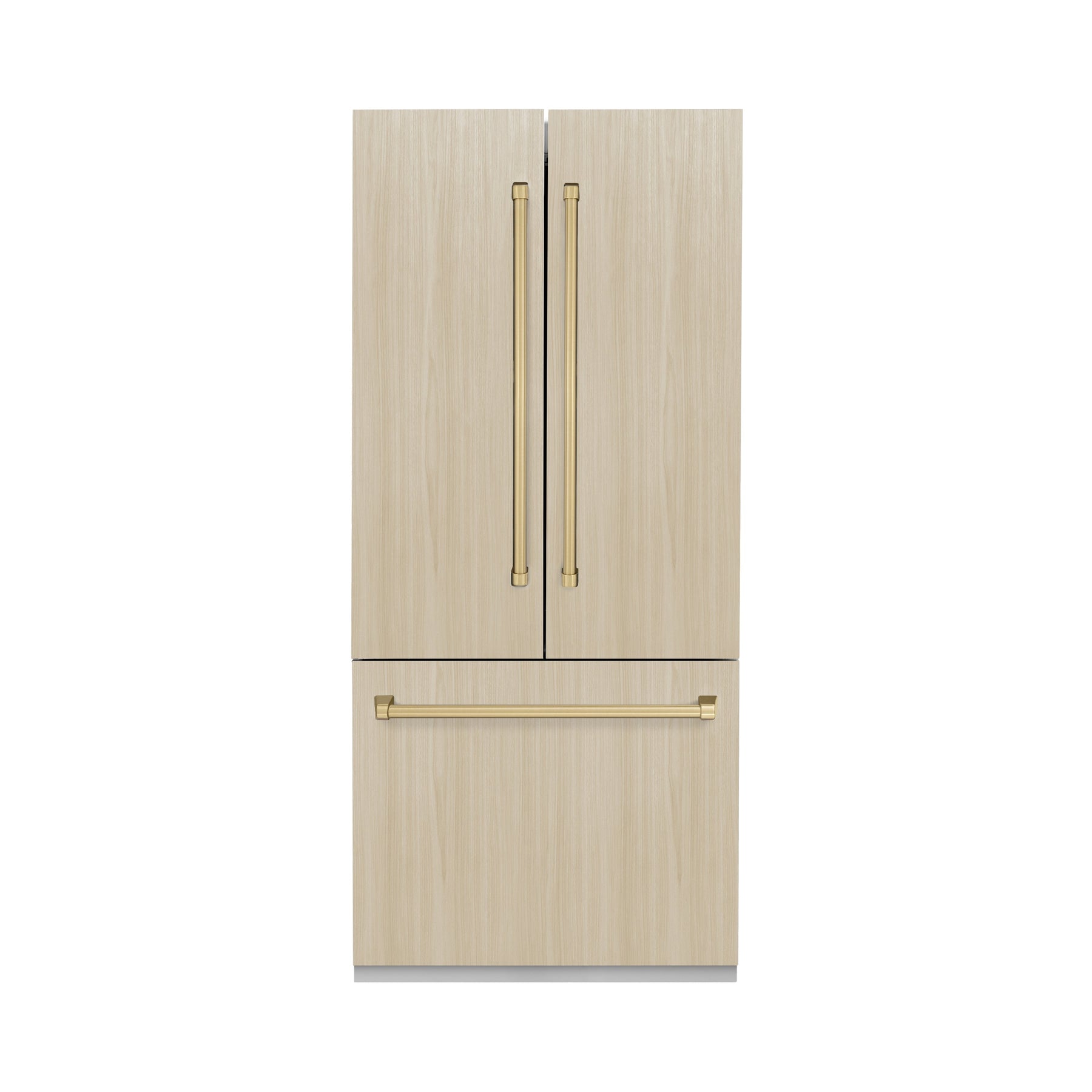 Enhance your kitchen with the ZLINE Autograph 36" 19.6 cu. ft. Built-In Panel-Ready 2-Door Bottom Freezer Refrigerator. This refrigerator combines high-quality performance with classic design, offering advanced capabilities such as adjustable temperatures, RapidChill Mode, and a concealed internal water and ice dispenser. Experience ZLINE's Attainable Luxury with this refrigerator, seamlessly blending innovation, elegance, and efficiency.