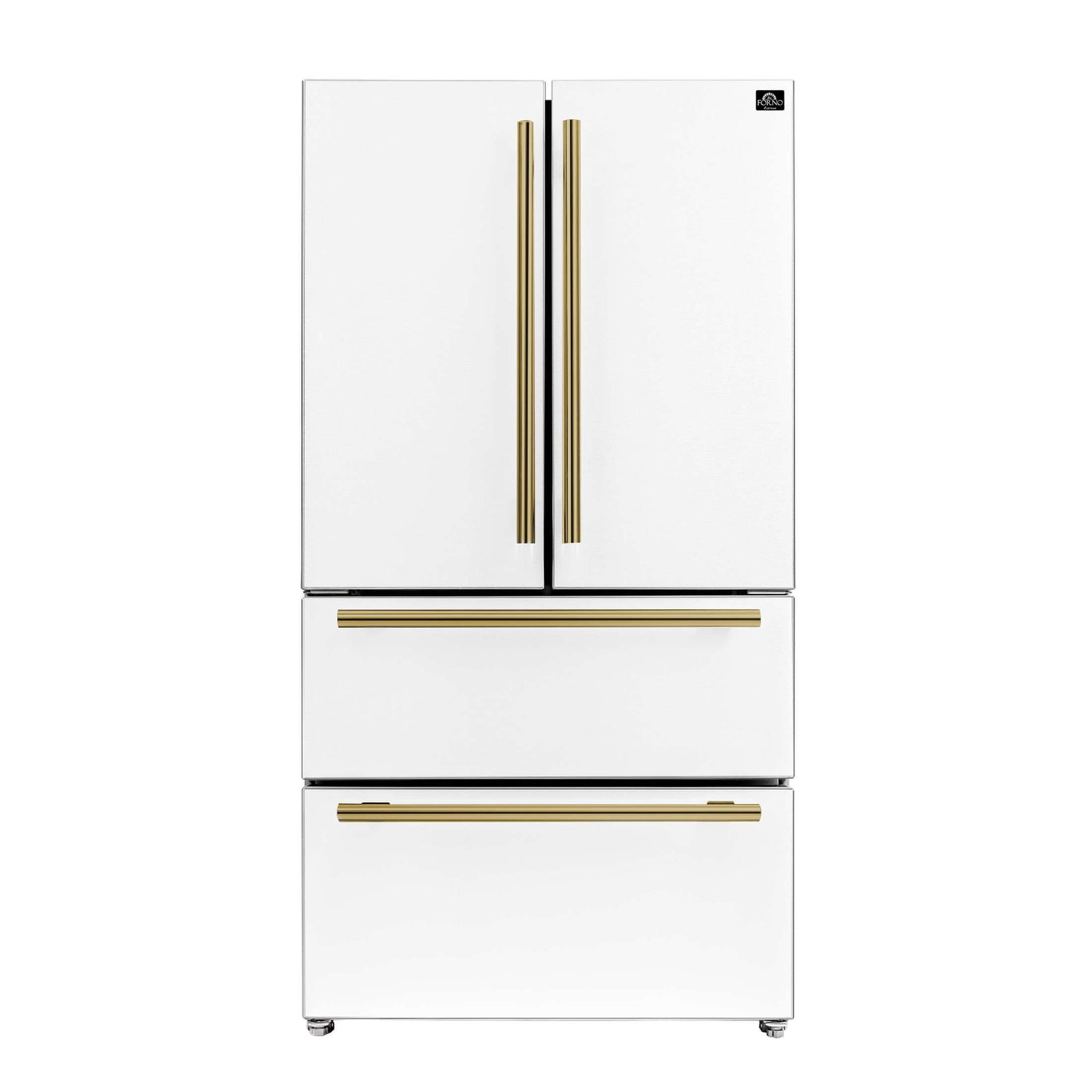 Forno Luigi 33-Inch French Door Refrigerator, 18 cu.ft, White Finish, Antique Brass Handles, ENERGY STAR Certified