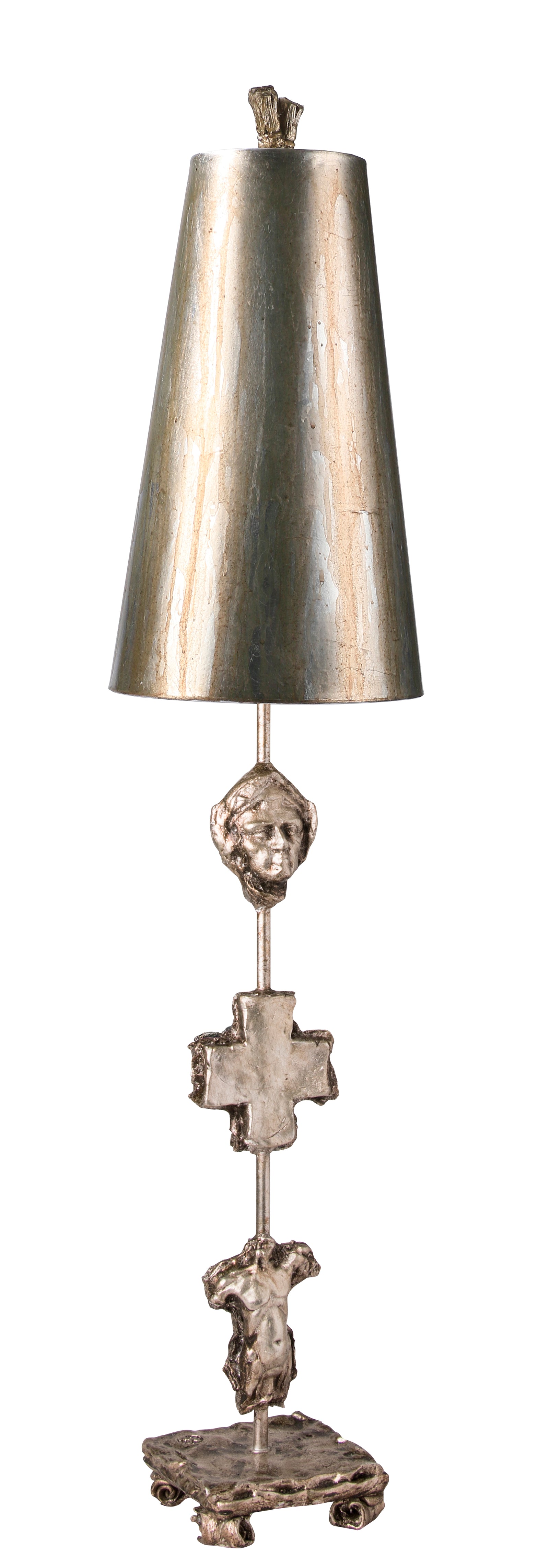- Silver leaf lamp features molded silhouettes of a torso, cross and face cast from original pieces of ancient stonework fragments. Silver leafed shade.