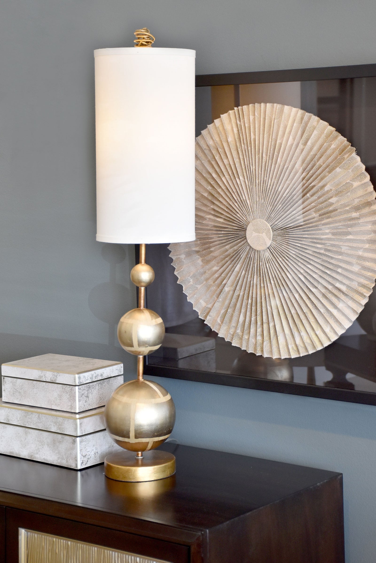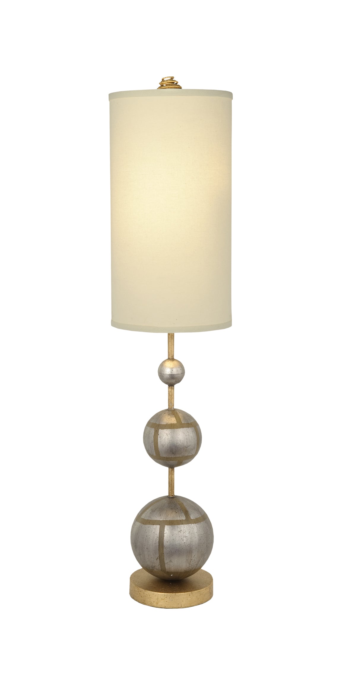 Not your average buffet lamp, this lighting fixture's distinctive shape and silver and gold leaf finish are sure to grab your attention. It sits atop a circular distressed gold base and is crafted with a stacked round orb-like feature for the column. A Cylinder shaped hemmed linen shade creates contrast while the whimsical metal finial adds the charming finishing touch to this 36" Buffet Table lamp.