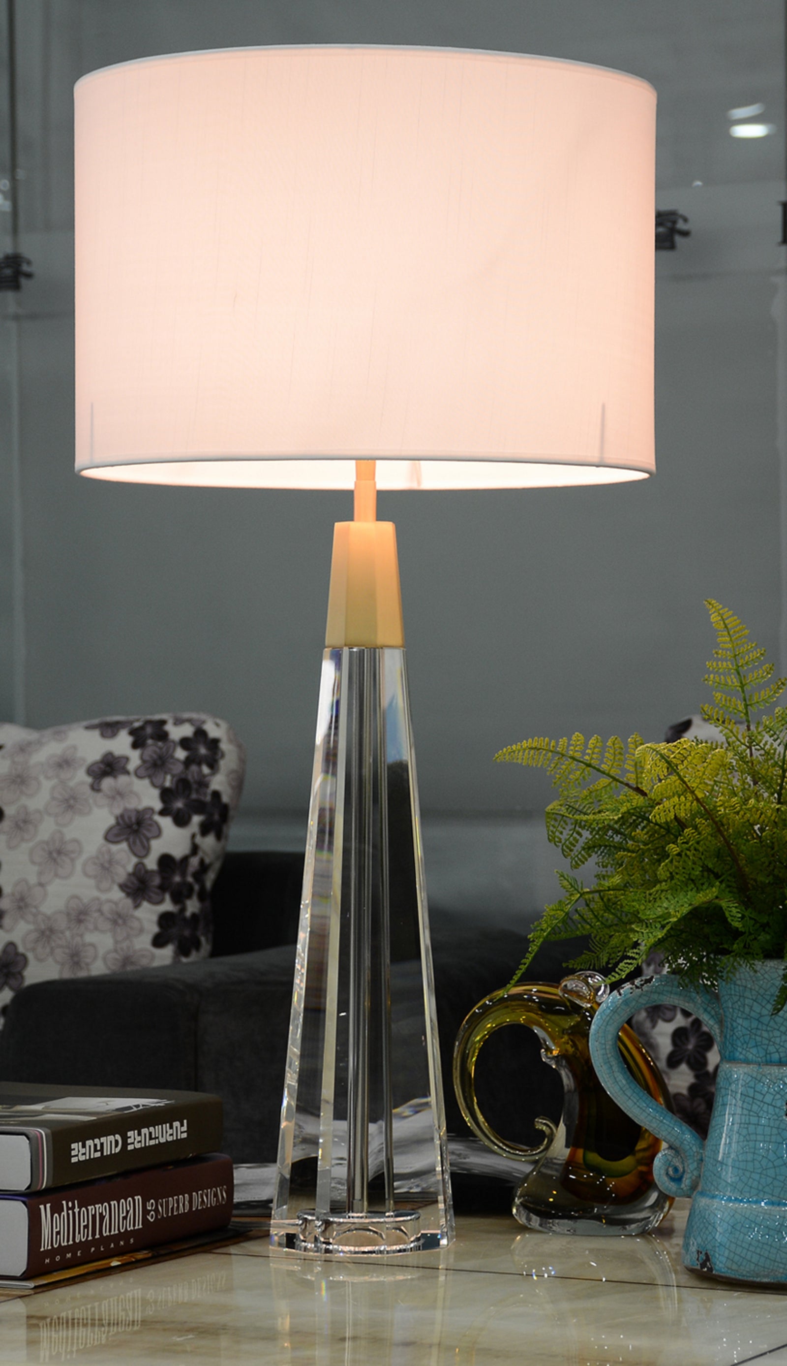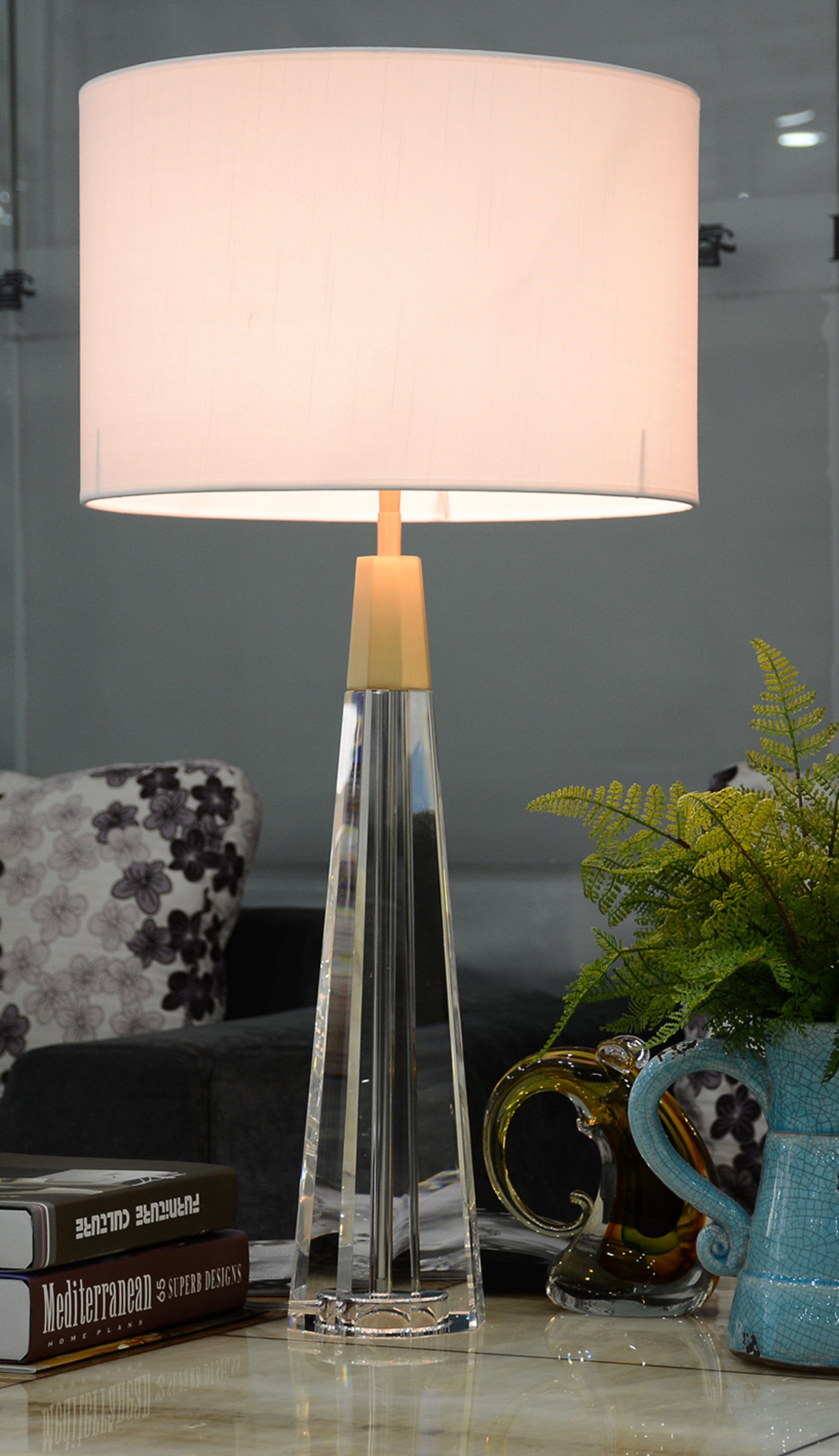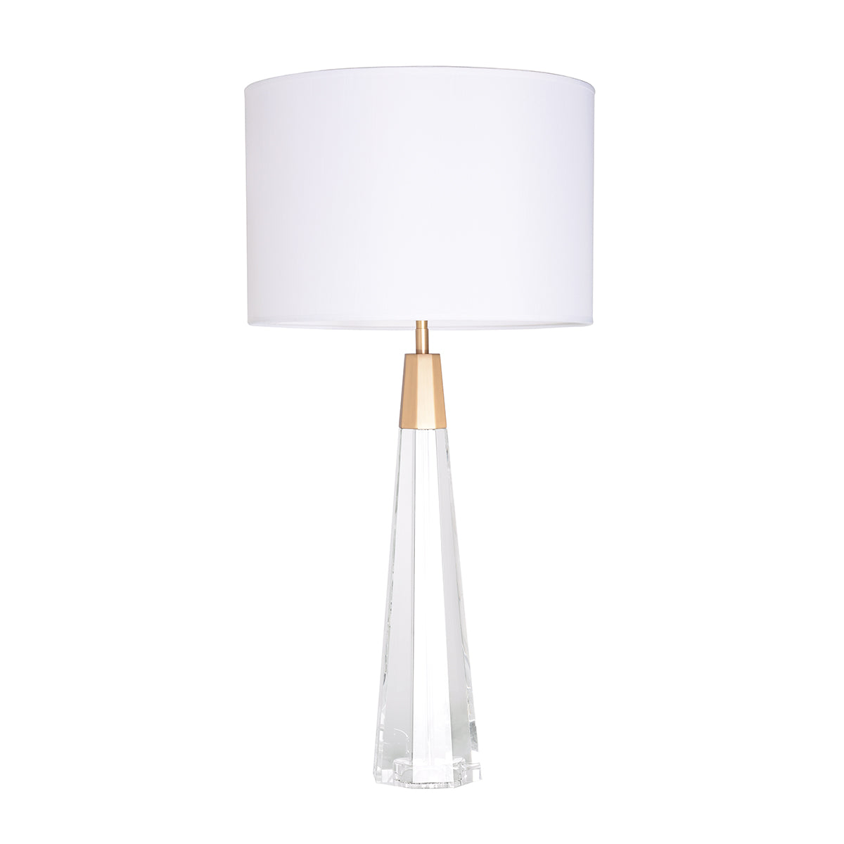 Sleek and sophisticated, our Monroe table lamp is inspired by a simple and timeless design that pairs a clear Crystal column with brushed brass accents. A stately piece that complements transitional, modern and traditional interiors, the Lucas + McKearn Monroe lamp is perfectly balanced with a faceted shaped base and a circular Drum shade of white linen. This clear glass table lamp will add an impressive feel of light and space to a room, with the angled glass subtly catching the light by day and sparkling when lit.