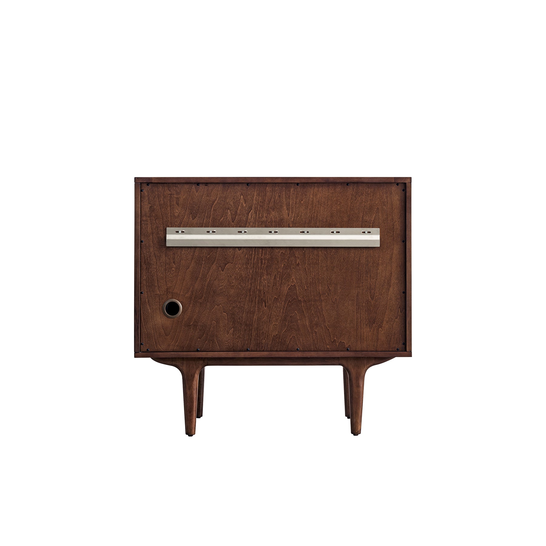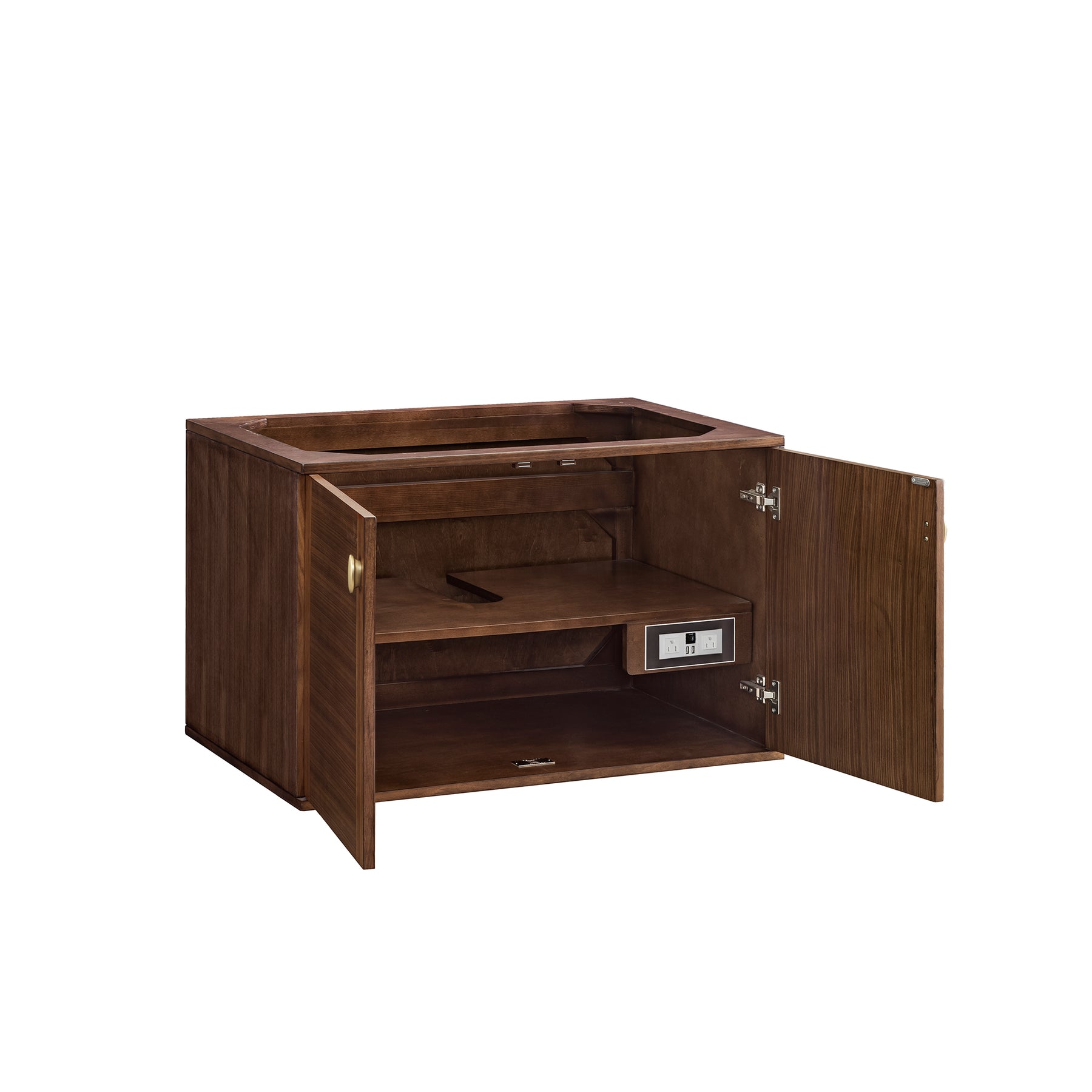 The 36" Amberly Single Vanity celebrates Mid-Century simplistic forms and finish details combined with practical function. The beauty of the natural grains in the walnut veneer steals the show, while the decorative, oval knobs in Champagne Brass provide the perfect accent. This two-door cabinet opens to a spacious interior with a single shelf and a convenient USB/Electric power outlet. The elegant wood base elevates the Vanity Cabinet in a true console style, though you may choose the more modern, space-saving wall-mount option.