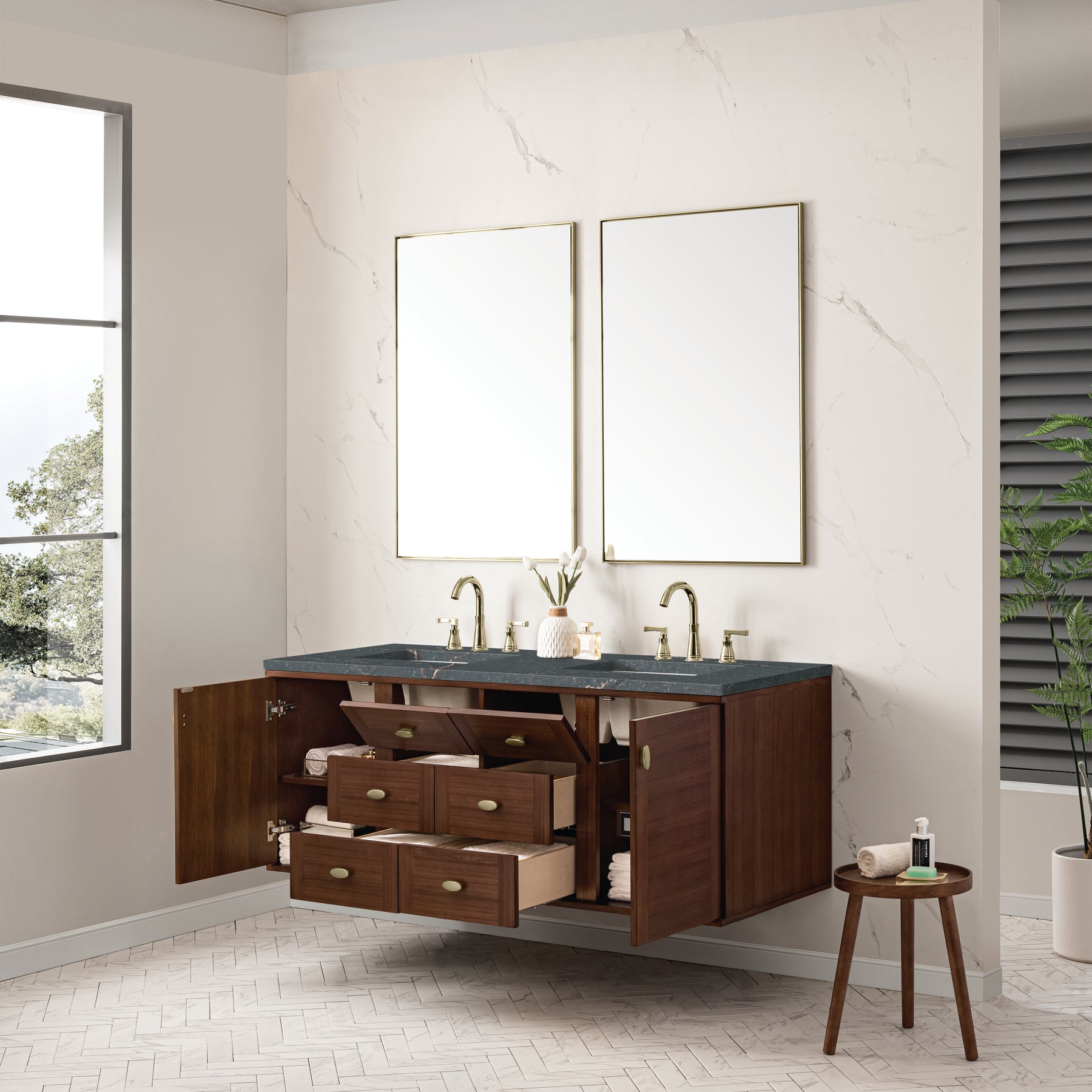 The Amberly 60" Double Vanity by James Martin Vanities celebrates Mid-Century Modern design by combining beautiful details with practical function. The beauty of the natural wood grain of the rich walnut veneers steal the show, while the decorative, oval knobs in Champagne Brass provide the perfect accent. This vanity features two single-door cabinets that open to interior shelves, four drawers, and two tip-out drawers. A convenient USB/120V power outlet and removable drawer organizer are also included. The rich walnut cabinet sits atop a wood base with tapered legs, completing the Mid-Century Modern look, but can be removed for a more modern, space-saving wall-mount option. The cabinet is topped with a gorgeous 3m Parisien Bleu Silestone® top with undermount sinks.