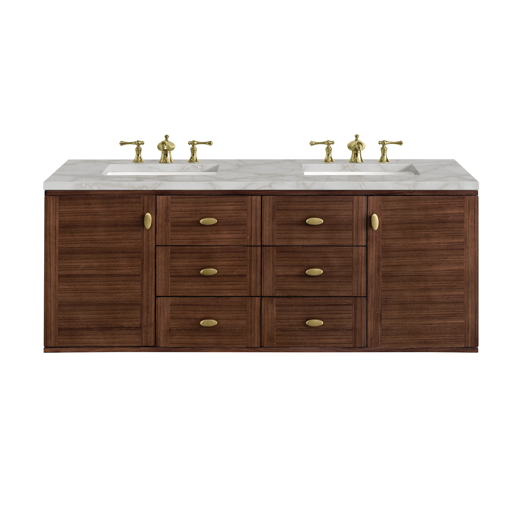The 60" Amberly Double Vanity celebrates Mid-Century simplistic forms and finish details combined with practical function. The beauty of the natural grains in the Walnut veneer steals the show, while the decorative, oval knobs in Champagne Brass provide the perfect accent. This two-door cabinet opens to spacious interior storage with adjustable shelves and a convenient USB/Electric power outlet. Six drawers provide ample storage and include one removable bamboo organizer. The top row drawers are tip-out style. The elegant wood base elevates the vanity cabinet in a true console style, though you may choose the more modern, space-saving wall-mount option. The Mid-Century Walnut finish is accented by the neutral background of the Victorian Silver Silestone top, boasting champagne metallic accents which seamlessly complement wood tones.