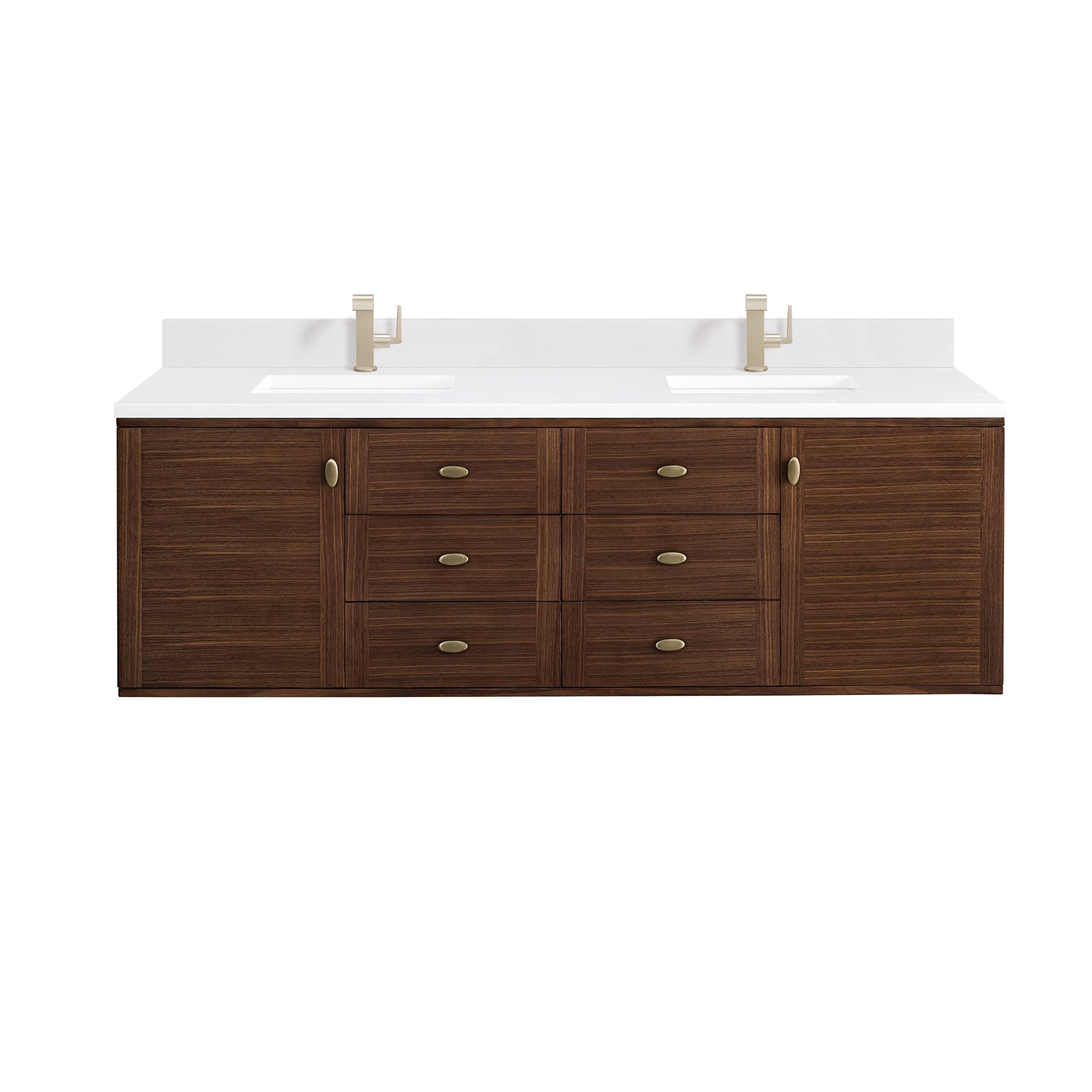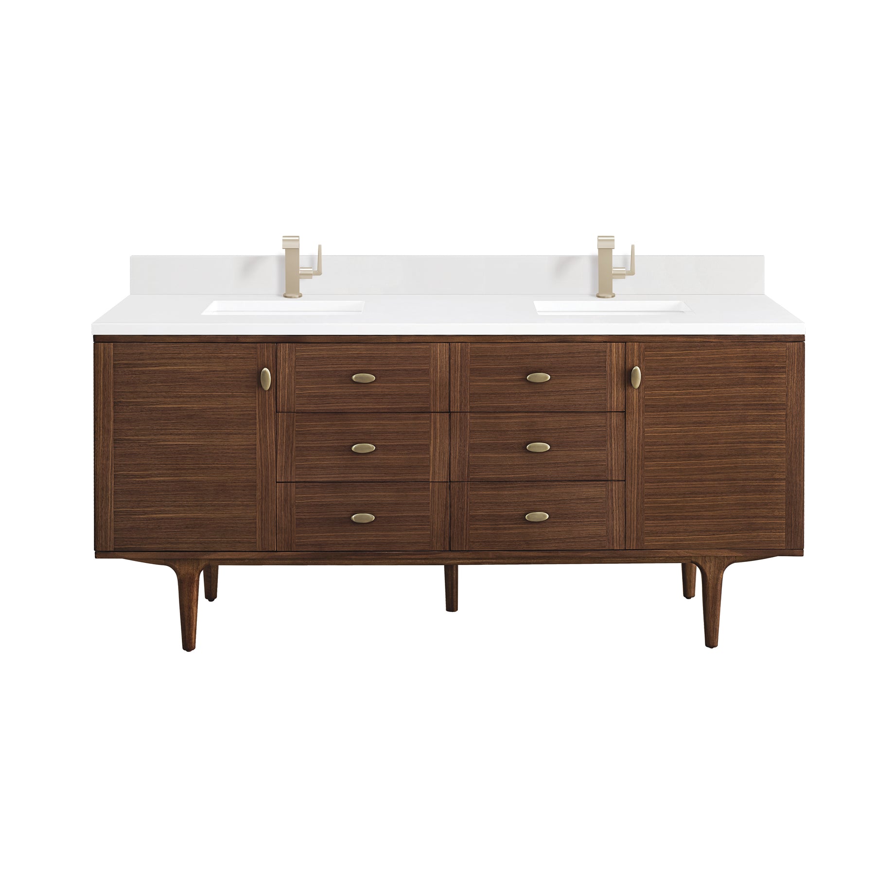 The 72" Amberly double vanity celebrates Mid-Century simplistic forms and finish details combined with practical function. The beauty of the natural grains in the Walnut veneer steals the show, while the decorative, oval knobs in Champagne Brass provide the perfect accent. This two-door cabinet opens to spacious interior storage with two adjustable shelves and a convenient USB/Electric power outlet. Six drawers provide ample storage and include one removable bamboo organizer. The top row drawers are tip-out style. An elegant wood base elevates the vanity cabinet in a true console style, though you may choose the more modern, space-saving wall-mount option. The timeless, White Zeus Silestone top and backsplash provides a contemporary touch.