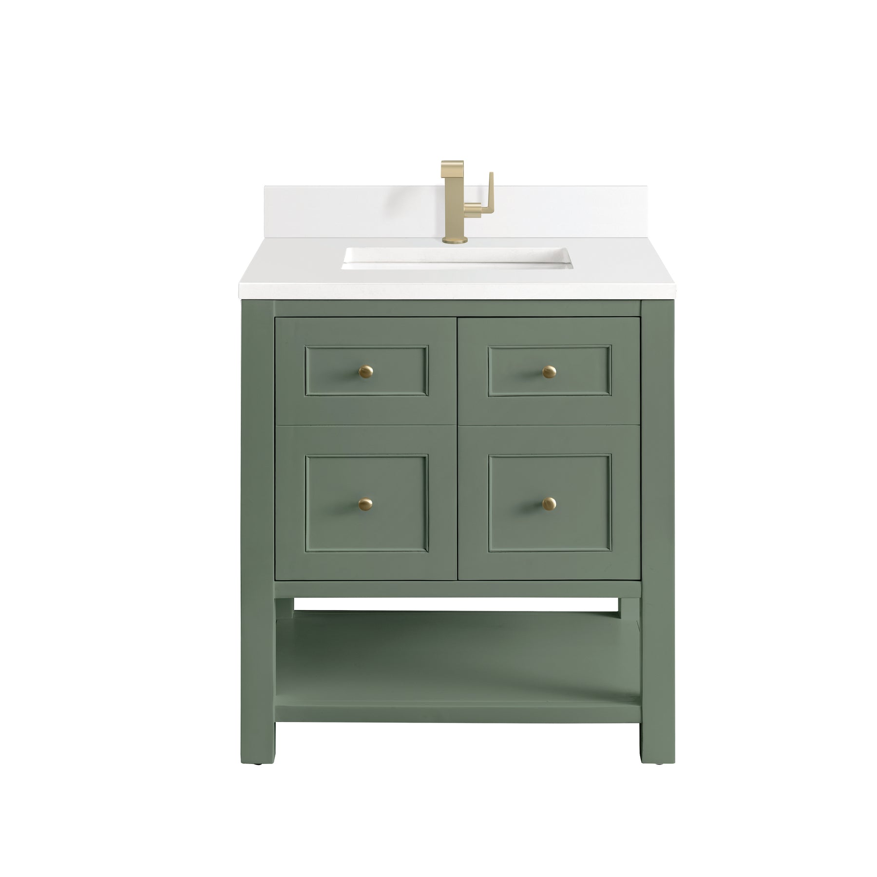 The Breckenridge 30" Single Vanity is a fresh take on traditional Mission furniture that easily transitions to Modern Farmhouse style with an air of understated sophistication. Champagne Brass knobs complement the Smokey Celadon finish, while the neatly inset door and drawer fronts lend a fresh appeal to this clean-lined classic. A two-door cabinet opens to reveal an interior shelf equipped with convenient built-in USB/120V power outlet. This console-style vanity also features an open lower shelf for additional storage. A single-hole faucet White Zeus Silestone top with undermount sink and backsplash complete the look with a contemporary touch.