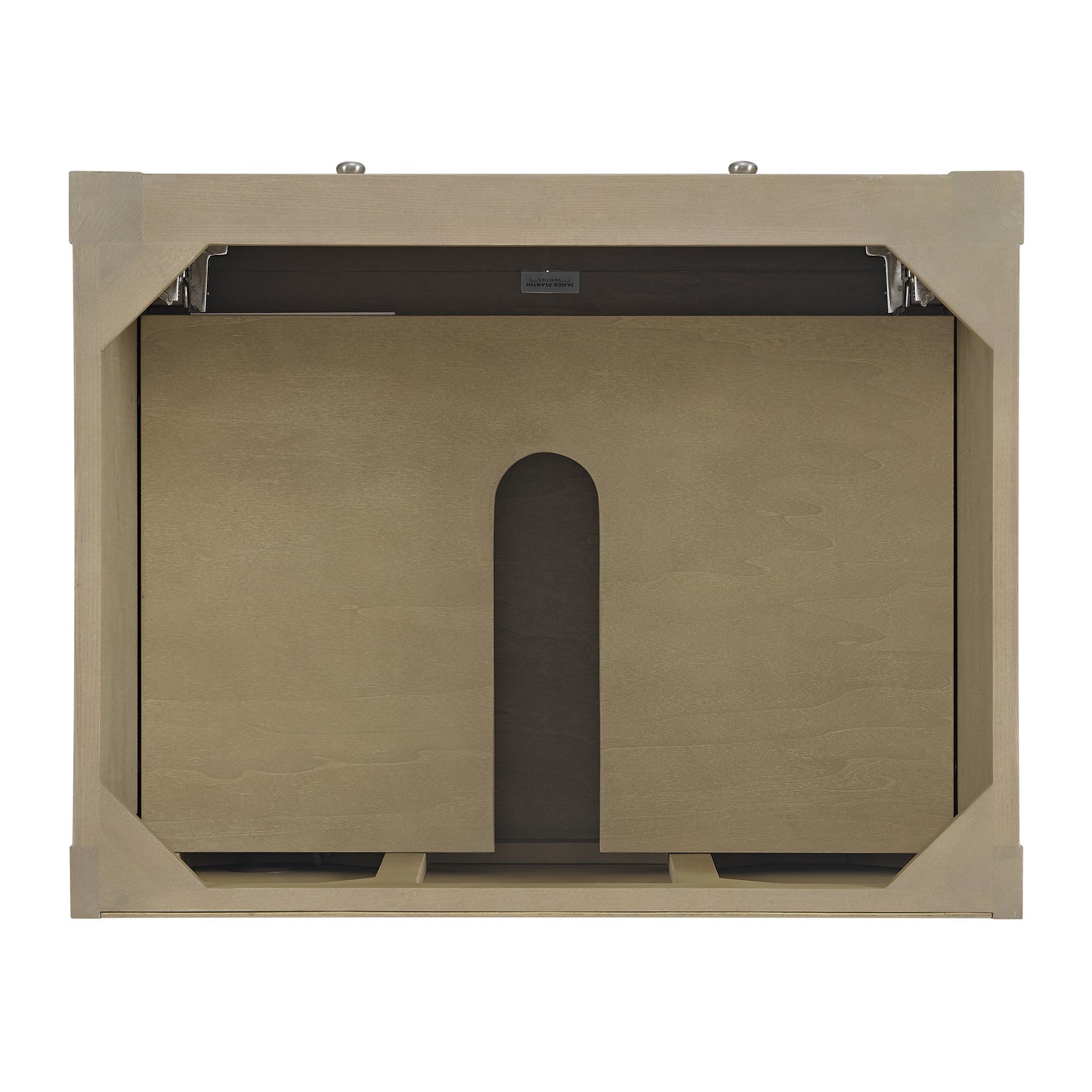 The Breckenridge 30" Single Vanity is a fresh take on traditional Mission furniture that easily transitions to Modern Farmhouse style with an air of understated sophistication. Satin Nickel knobs complement the Whitewashed Oak finish, while the neatly inset door and drawer fronts lend a fresh appeal to this clean-lined classic. A two-door cabinet opens to reveal an interior shelf equipped with convenient built-in USB/120V power outlet. This console-style vanity also features an open lower shelf for additional storage. A modern Arctic Fall Solid Surface Silestone top with undermount sink completes the look.