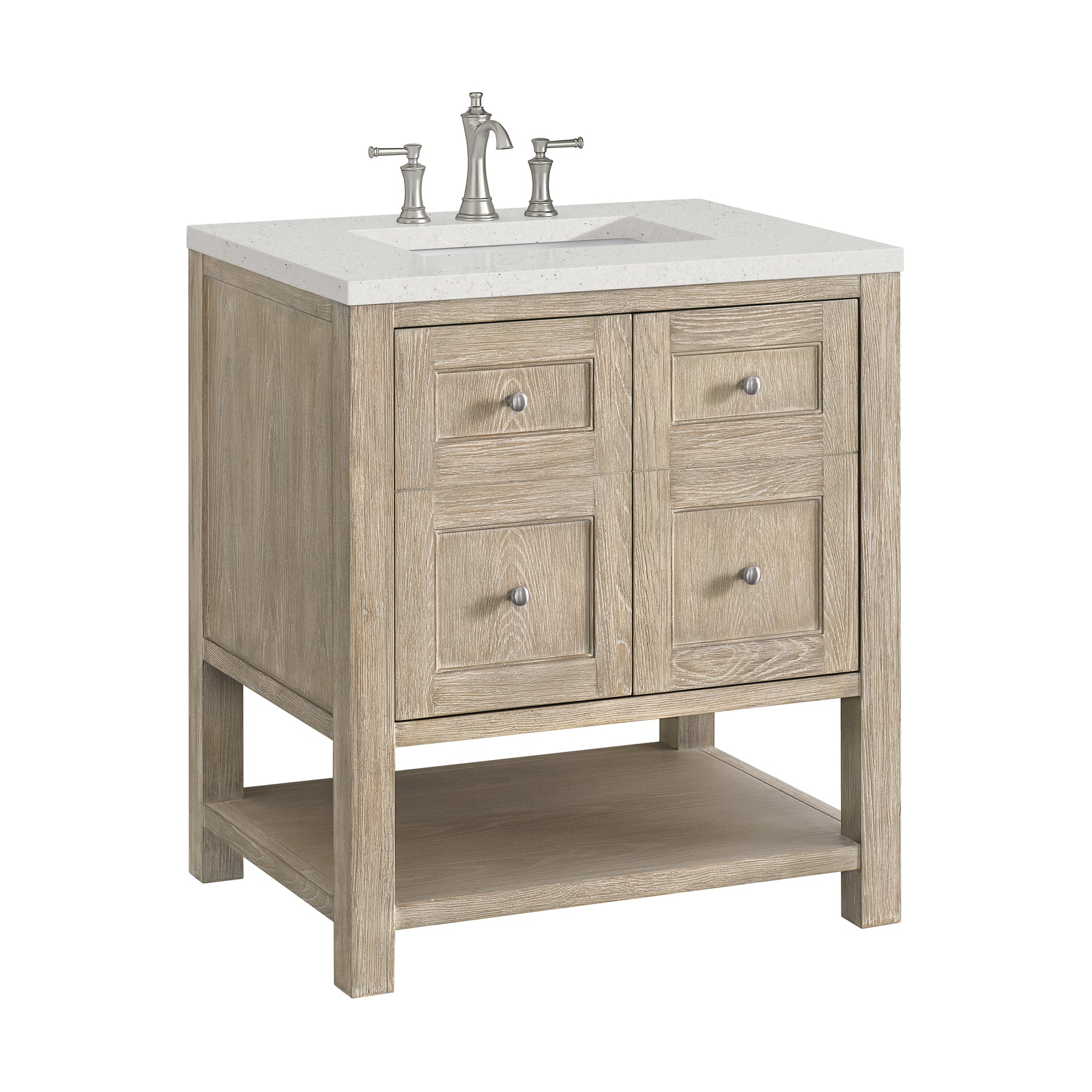 The Breckenridge 30" Single Vanity is a fresh take on traditional Mission furniture that easily transitions to Modern Farmhouse style with an air of understated sophistication. Satin Nickel knobs complement the Whitewashed Oak finish, while the neatly inset door and drawer fronts lend a fresh appeal to this clean-lined classic. A two-door cabinet opens to reveal an interior shelf equipped with convenient built-in USB/120V power outlet. This console-style vanity also features an open lower shelf for additional storage. A suede-finished Lime Delight Silestone top with undermount sink completes the look.