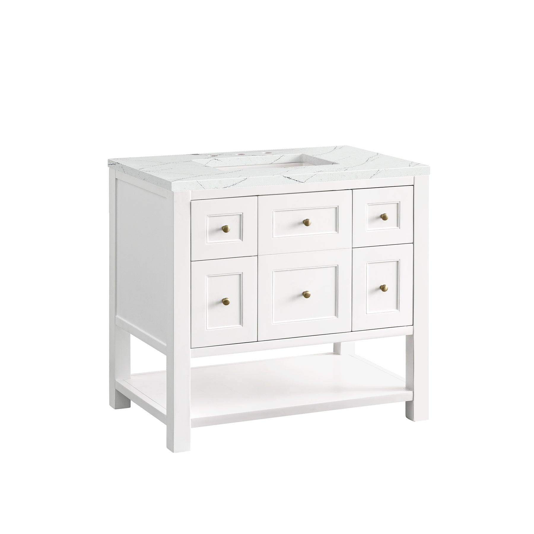 The Breckenridge 36" Single Vanity is a fresh take on traditional Mission furniture that easily transitions to Modern Farmhouse style with an air of understated sophistication. Champagne Brass knobs complement the Bright White finish, while the neatly inset door and drawer fronts lend a fresh appeal to this clean-lined classic. A single-door cabinet opens to reveal an interior shelf equipped with convenient built-in USB/120V power outlet. This console-style vanity also features two top-row tip-out drawers, two standard full-extension drawers, and an open lower shelf for additional storage. A stunning Ethereal Noctis Silestone top with undermount sink completes the look.