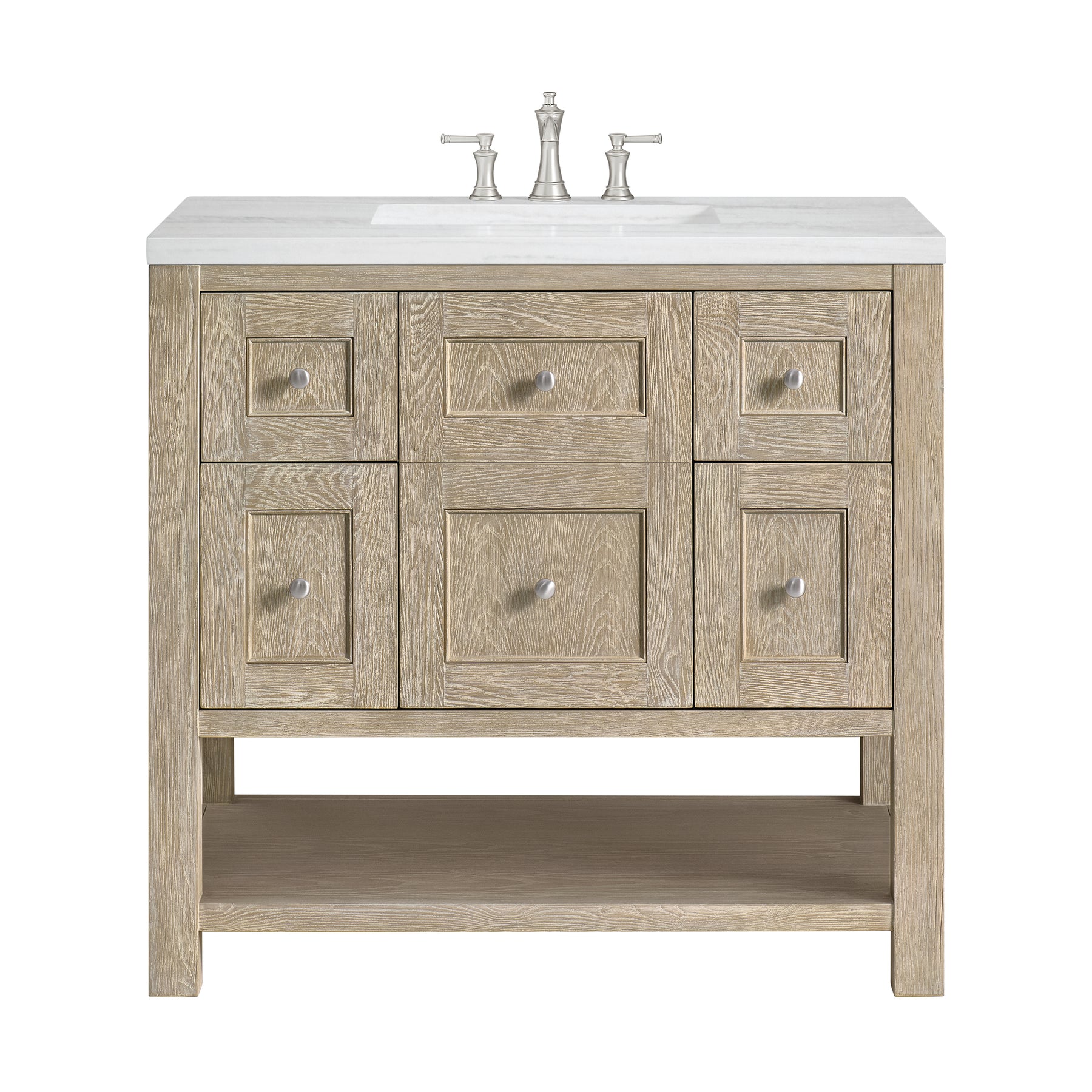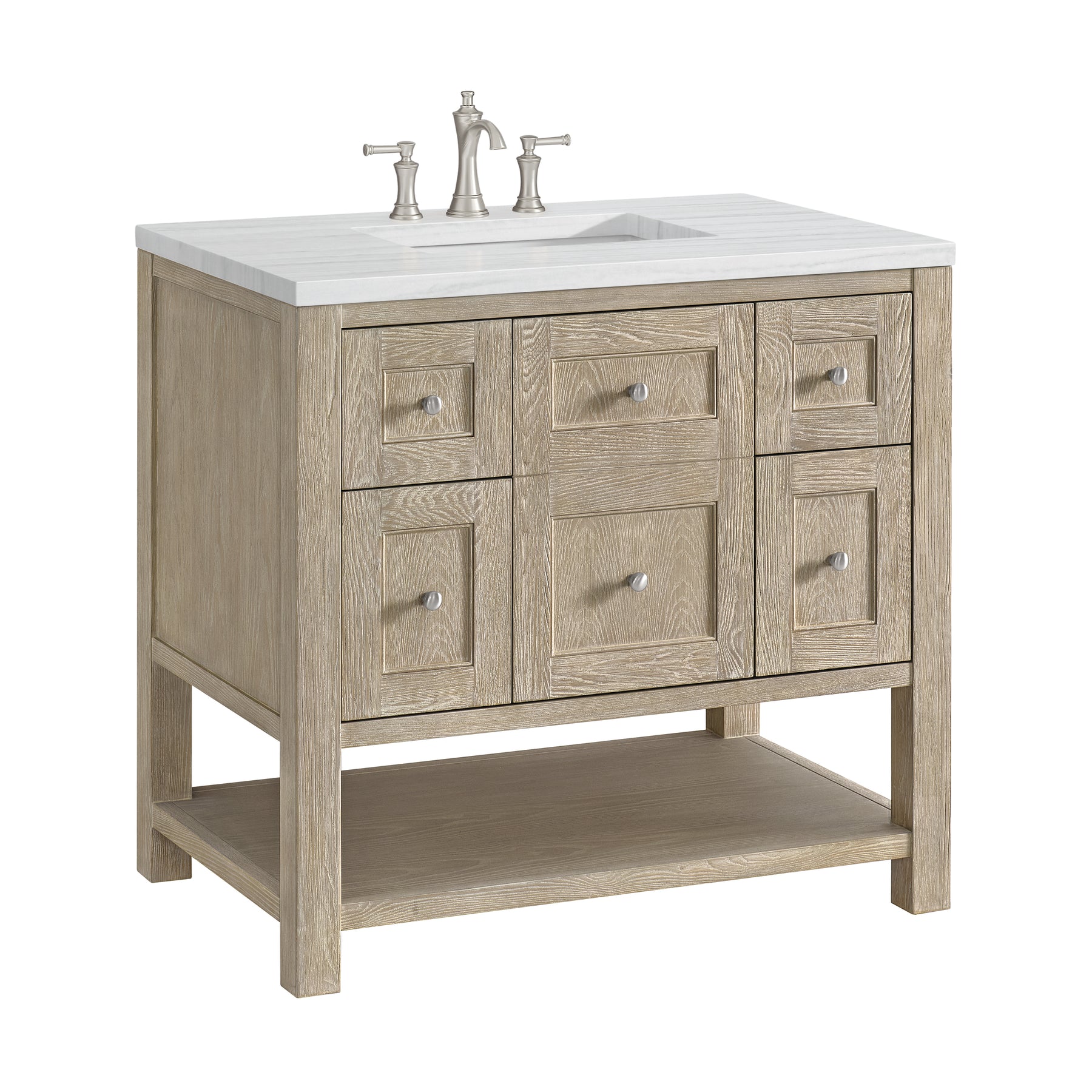 The Breckenridge 36" Single Vanity is a fresh take on traditional Mission furniture that easily transitions to Modern Farmhouse style with an air of understated sophistication. Satin Nickel knobs complement the Whitewashed Oak finish, while the neatly inset door and drawer fronts lend a fresh appeal to this clean-lined classic. A single-door cabinet opens to reveal an interior shelf equipped with convenient built-in USB/120V power outlet. This console-style vanity also features two top-row tip-out drawers, two standard full-extension drawers, and an open lower shelf for additional storage. A modern Arctic Fall Solid Surface top with undermount sink completes the look.